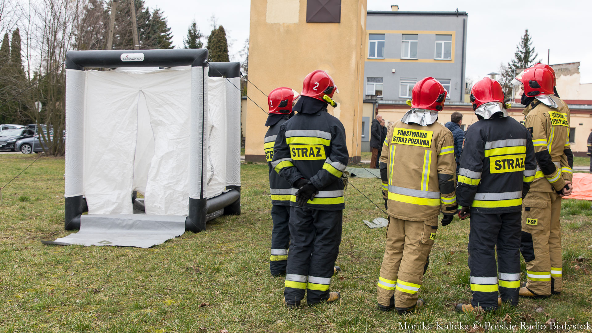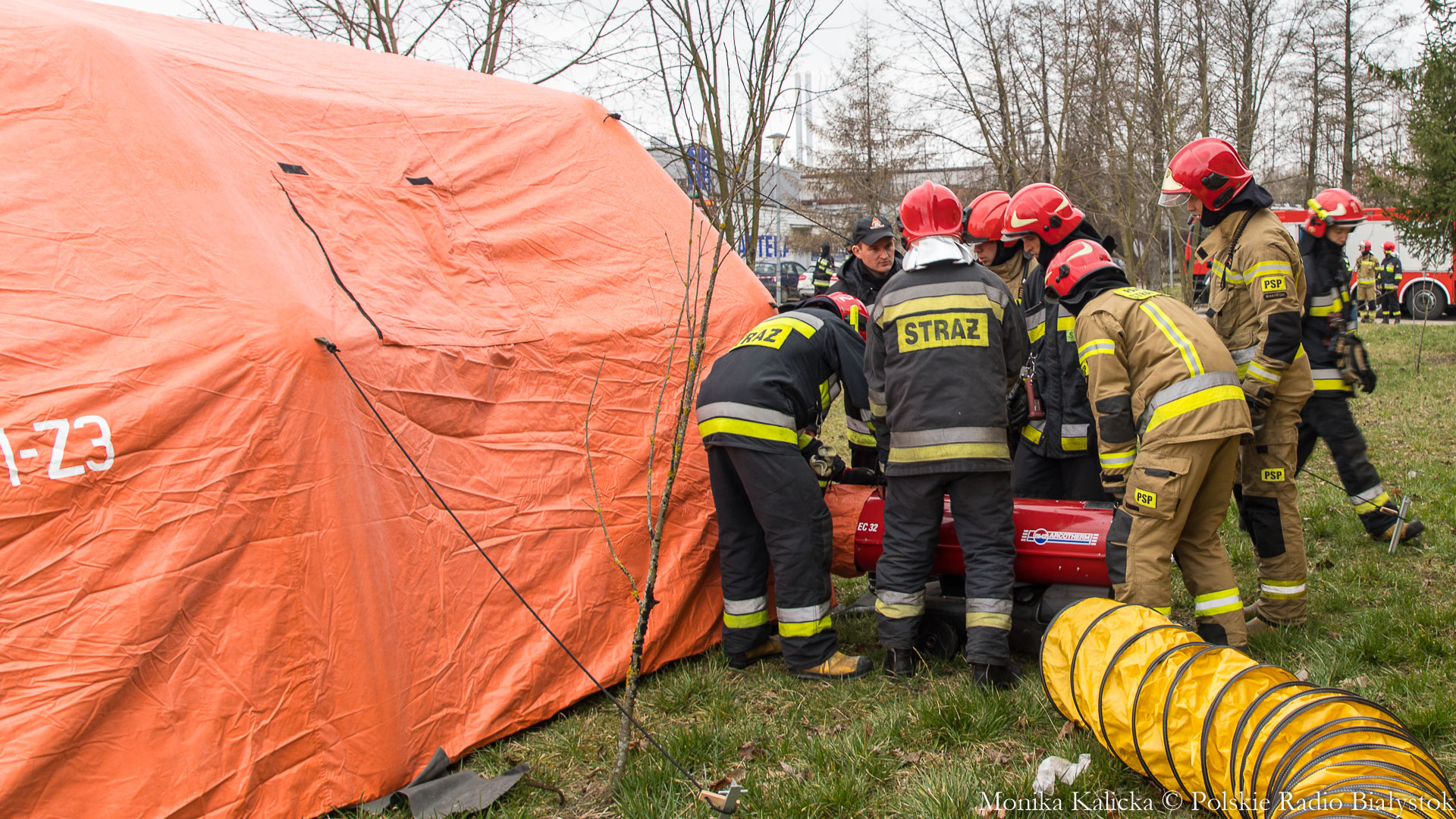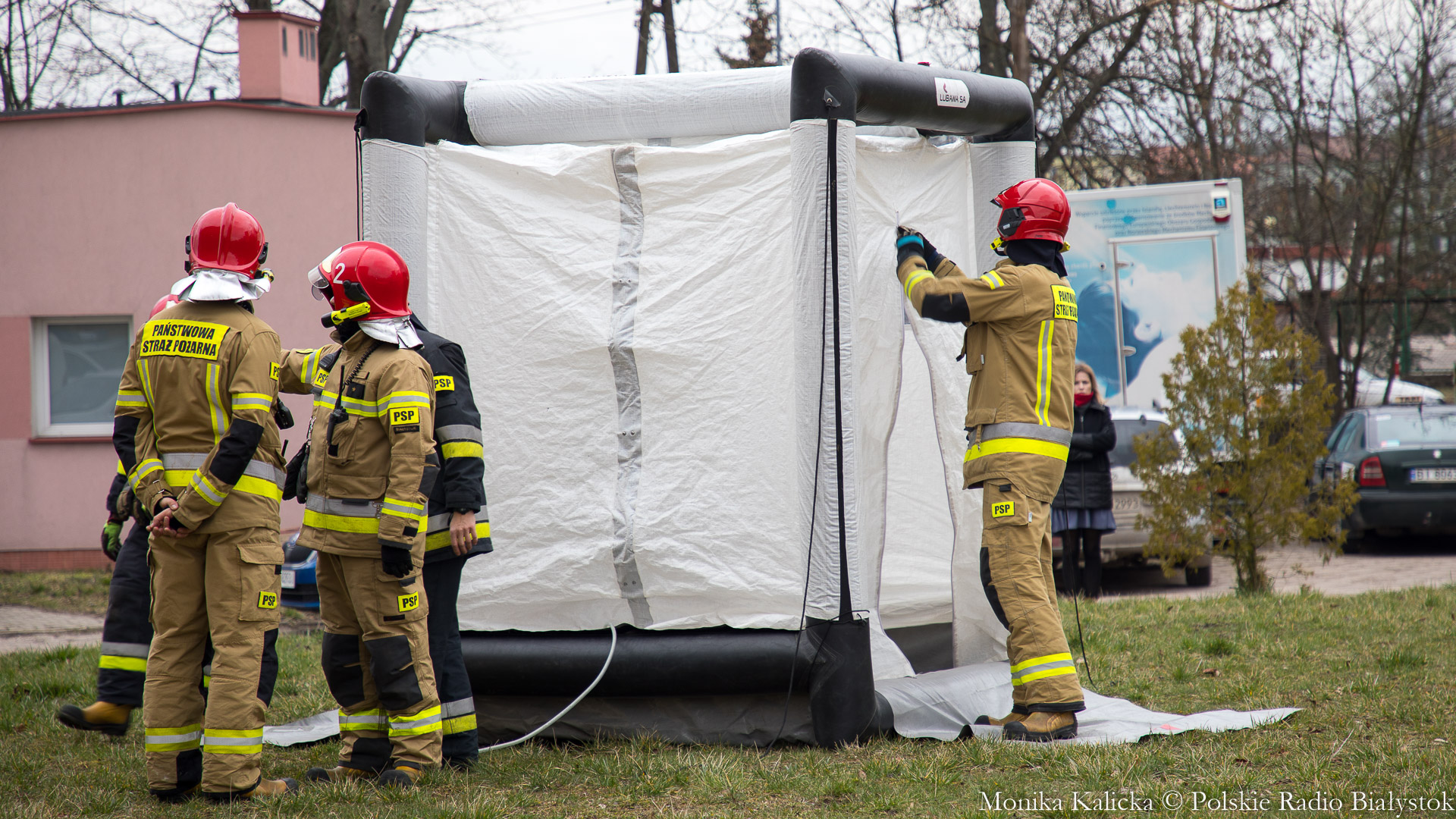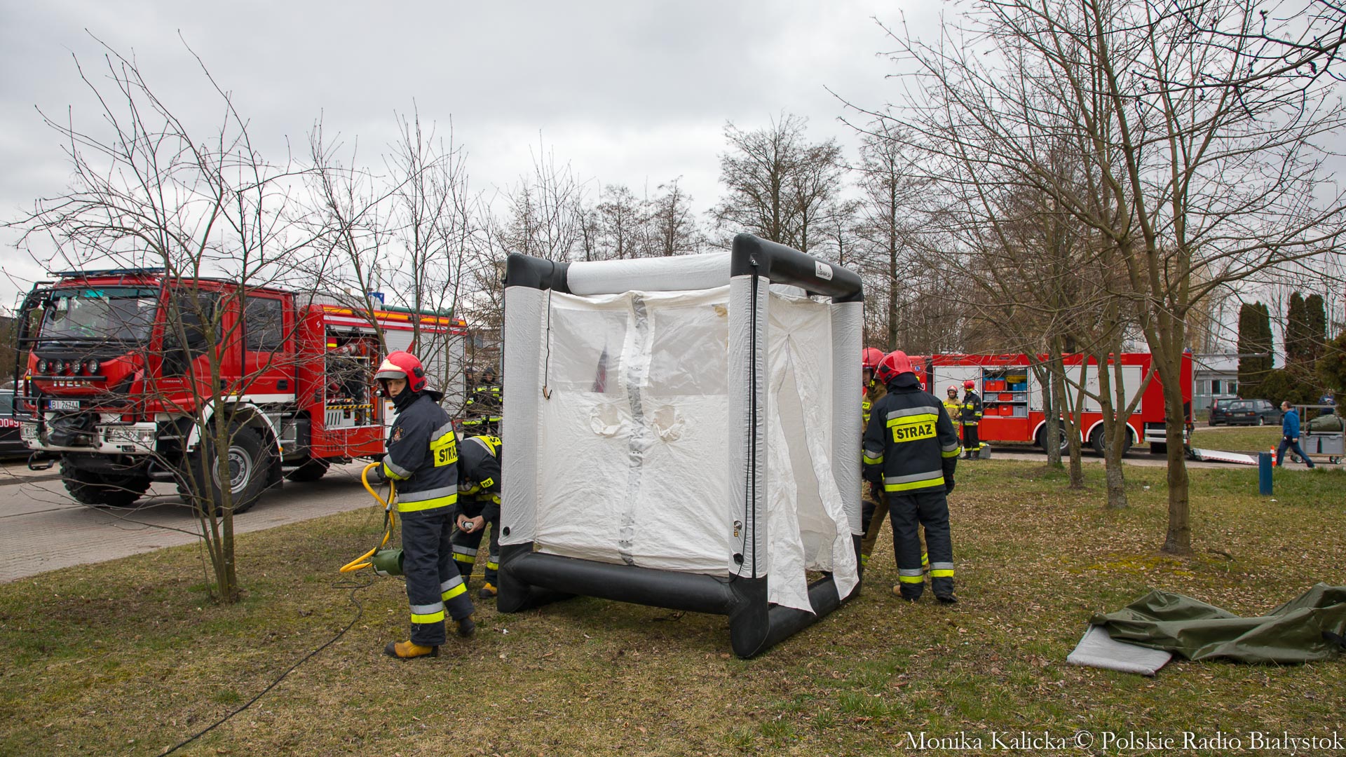 Komendant Wojewódzki Państwowej Straży Pożarnej w Białymstoku Jarosław Wendt wyjaśnił, że ćwiczenia z rozstawianiem pneumatycznego namiotu nie są skomplikowane. Oprócz Białegostoku miały się także odbyć przed szpitalem wojewódzkim w Suwałkach. Wendt dodał, że namiot ma wymagany osprzęt, by mogły w nim pracować zespoły medyczne, jest także ogrzewany. Namioty będą stały do odwołania.