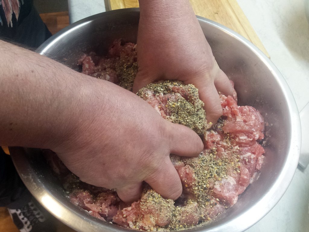 Mięso przygotowujemy dzień przed nadziewaniem go do jelit. Część mięsa z elementami tłustymi i słoniną mielimy przez sitko o grubych oczkach. Drugą część kroimy w dość dużą kostkę. W szklance zimnej wody rozpuszczamy sól (na 5 kg mięsa 6 łyżeczek soli i 3 łyżeczki cukru). Wlewamy to do miski z mięsem. Długo mieszamy, aż pojawi się tzw. klej. Na całą noc odstawiamy do lodówki. Na drugi dzień oddajemy czarny pieprz i gorczycę (zmiażdżoną w moździerzu). Jeśli mięso jest za mało doprawione, to znowu można dodać wodę z rozpuszczoną solą i cukrem. Następnie mięsem nadziewamy wymoczone wcześniej jelita. Tak przygotowaną kiełbasę gotujemy lub pieczemy. Podajemy z sosem.