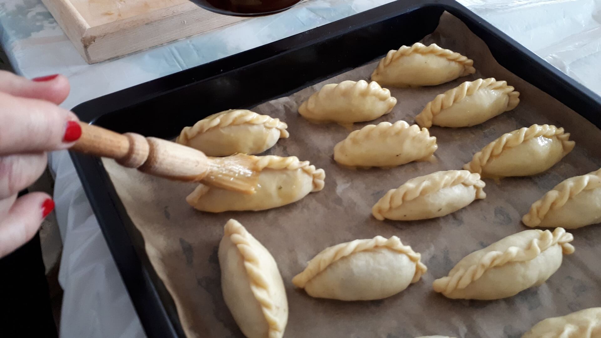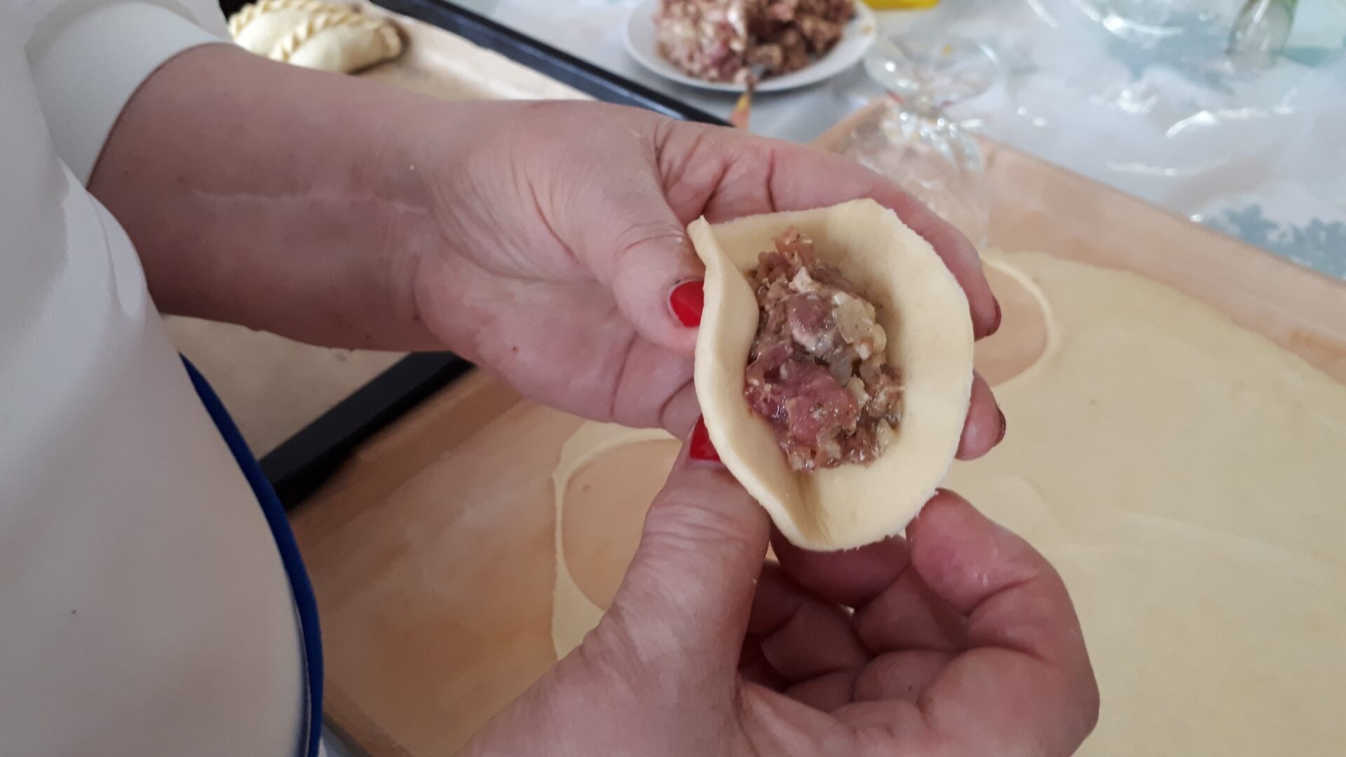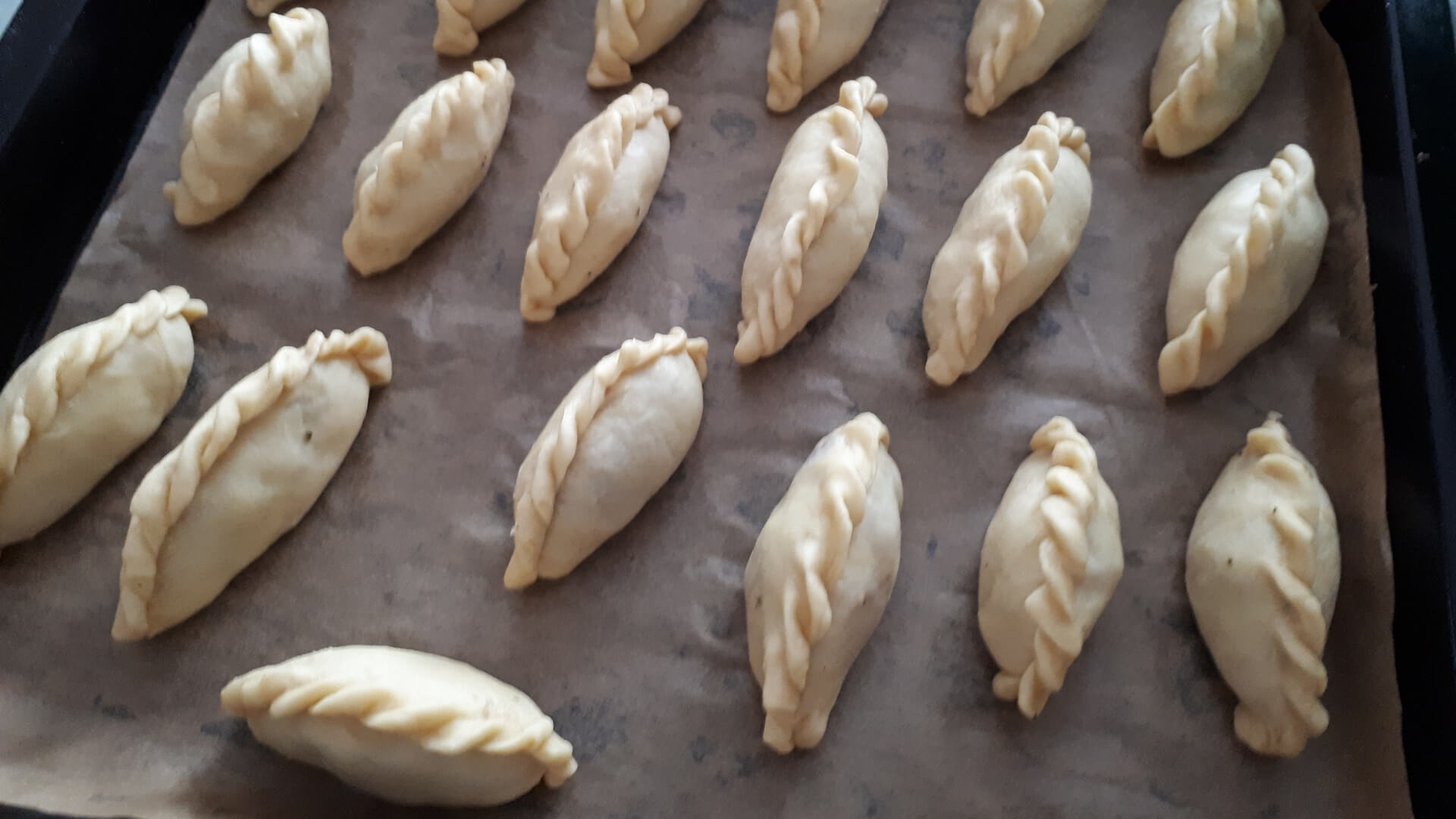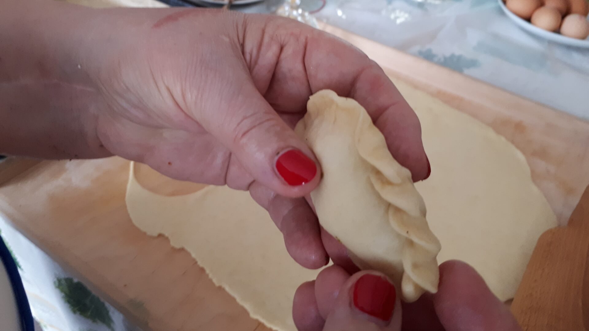 Na stolnicy mąkę siekamy z masłem (temperatura pokojowa, by było miękkie). W śmietanie rozbijamy jajka i dodajemy do ciasta, które odrobinę solimy. Dobrze wyrobione ciasto odstawiamy na kilkanaście minut do lodówki. Potem ciasto rozwałkowujemy jak na makaron, wykrajamy większe krążki (odciskamy na przykład pucharek na lody). Nadziewamy krążki farszem i sklejamy w warkocz. Układamy na blasze wyłożonej papierem do pieczenia. Pierogi ustawiamy warkoczem do góry i obficie smarujemy je roztrzepanym jajkiem. Pieczemy około godziny w 180 stopniach Celsjusza.
