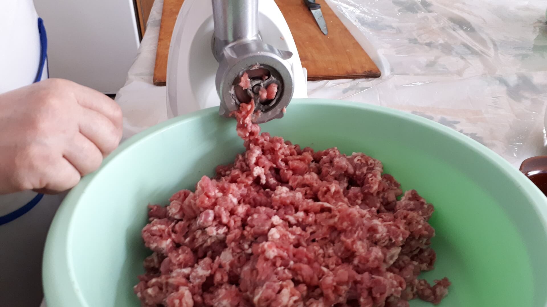 Mięso mielimy przez grube oczka jak na kiełbasę. Siekamy czosnek, który uciskamy z solą i dodajemy do mięsa. Pokrojoną cebulę podsmażamy, dodajemy ją do mięsa po ostudzeniu. Przyprawiamy farsz solą, pieprzem i majerankiem. Dość długo wyrabiamy mięso dodając też ponad szklankę przegotowanej (lub mineralnej) wody. Tak przygotowane mięso odstawiamy na kilkanaście minut do lodówki.