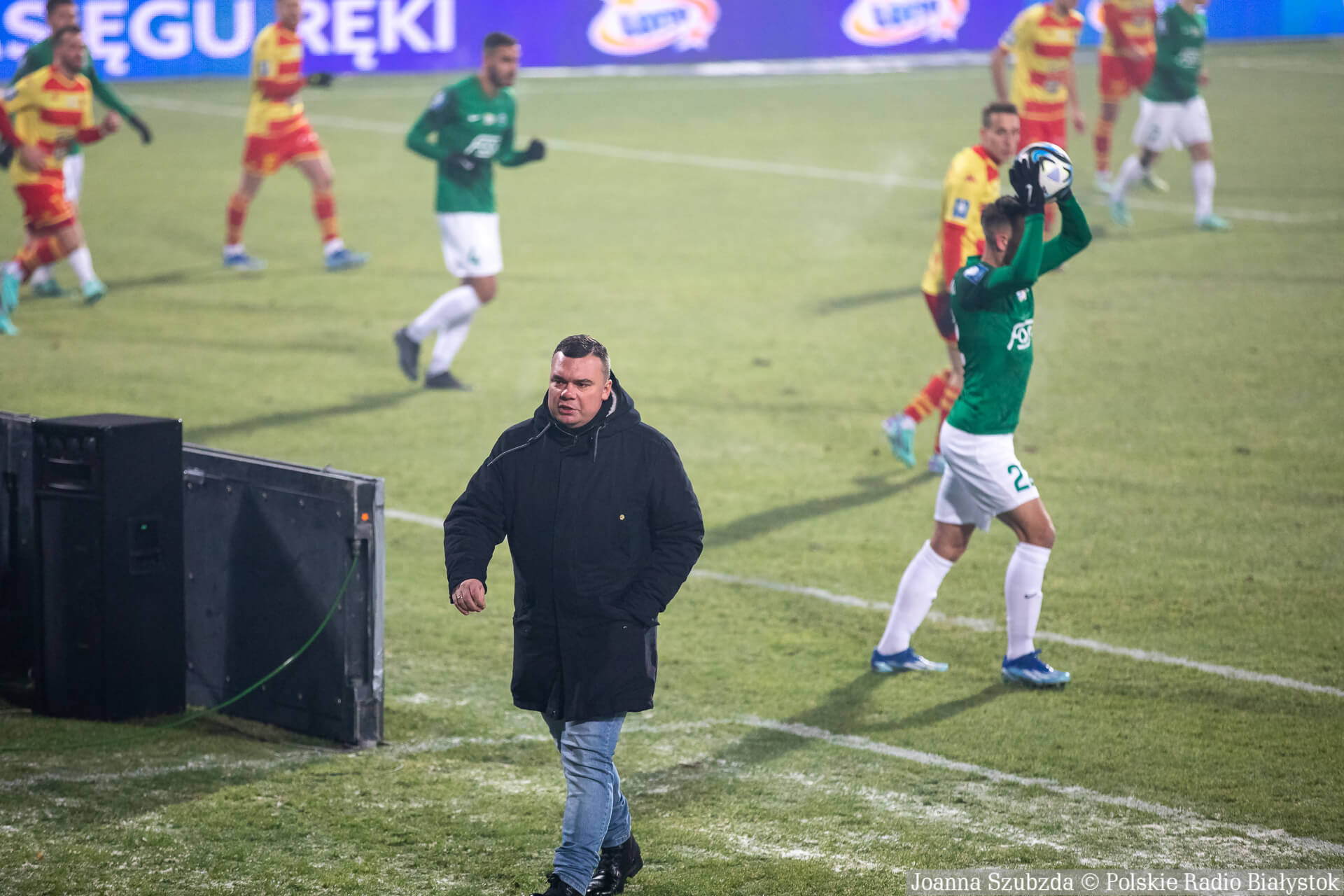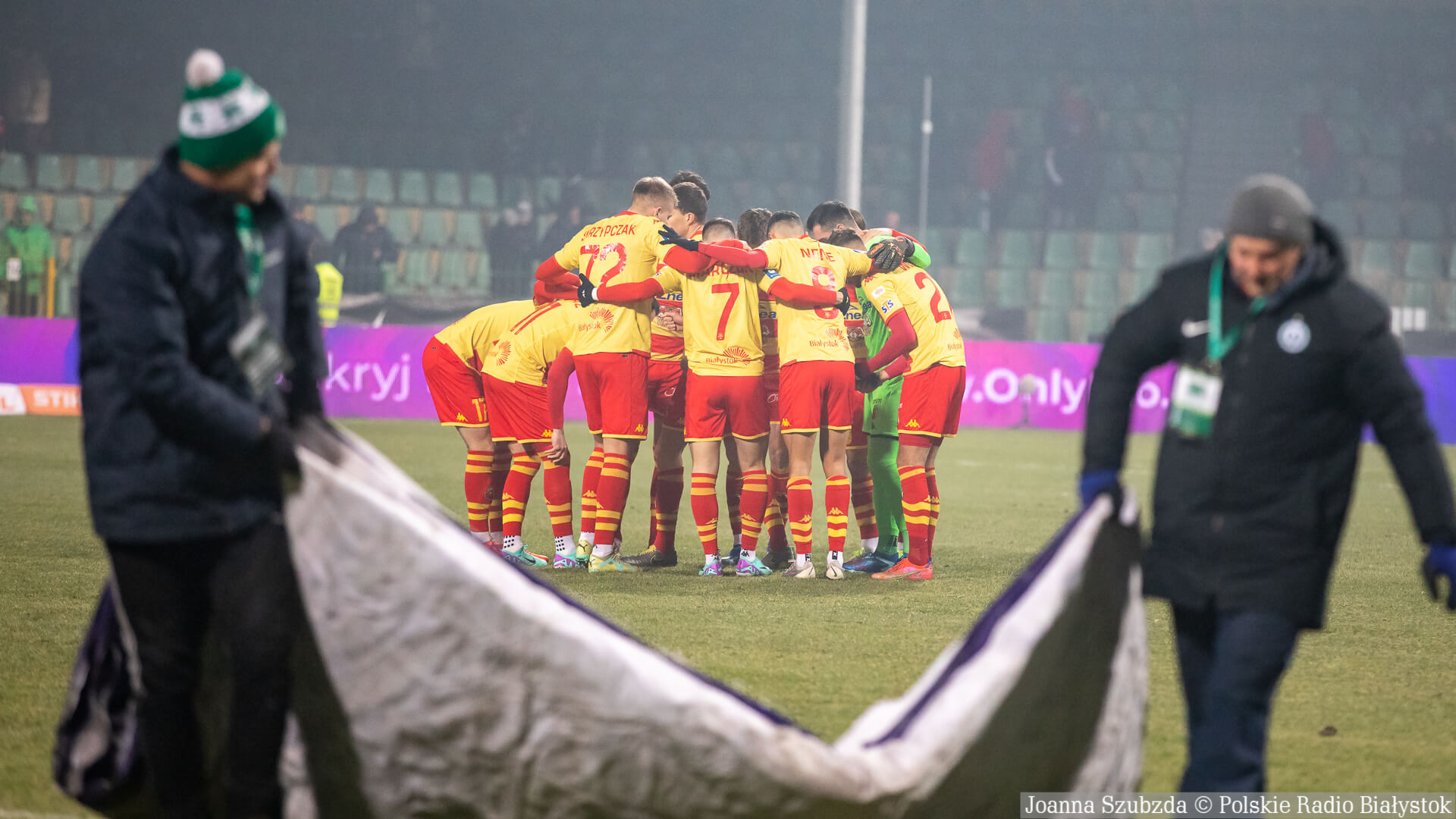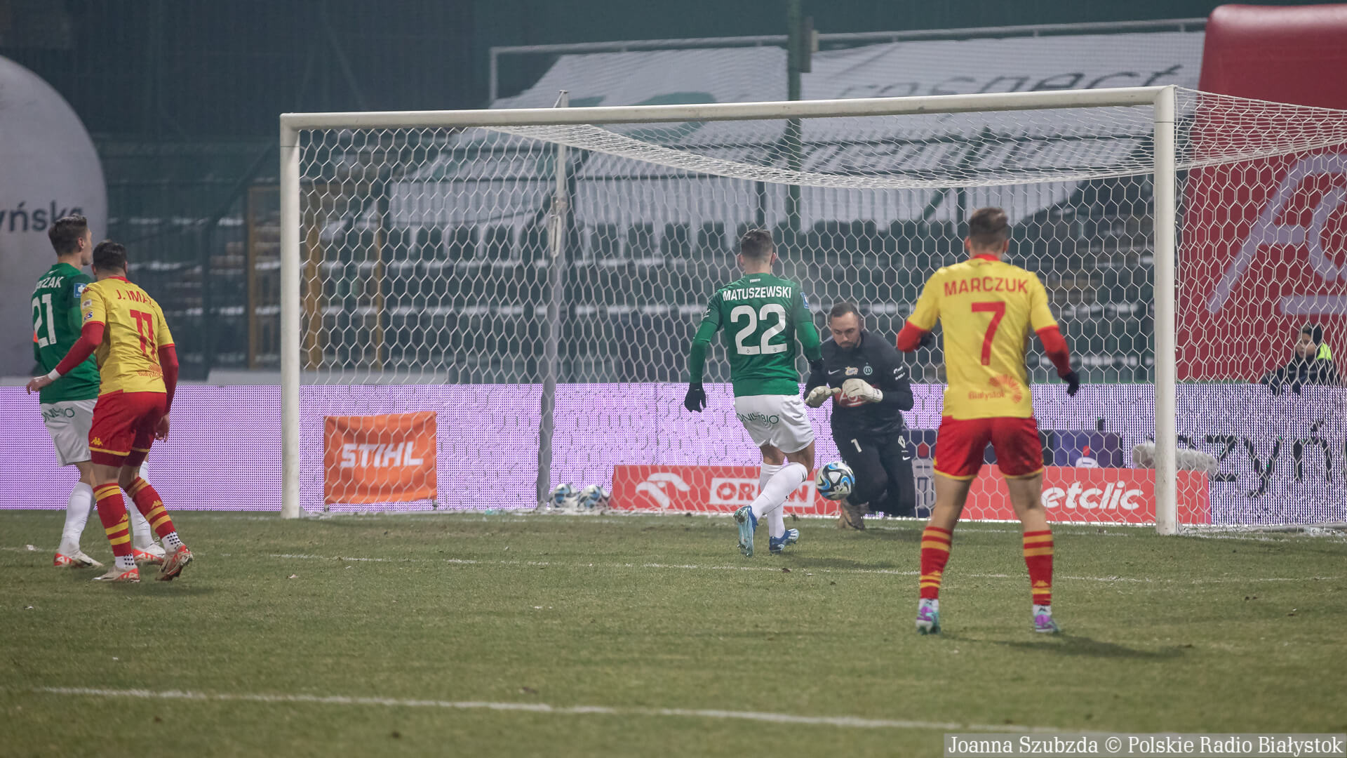 Podopieczni Dawida Szulczka wciąż mieli przewagę i po piątym rzucie rożnym doprowadzili do wyrównania. Tym razem nie popisał się bramkarz białostockiego zespołu, który nieczysto piąstkował i piłka niemal wpadła na głowę Macieja Żurawskiego. Pomocnik gospodarzy nie mógł nie trafić do siatki, a po chwili cała drużynę wykonała kołyskę z dedykacją dla Mateusza Kupczaka, któremu w piątek rano urodził się syn.