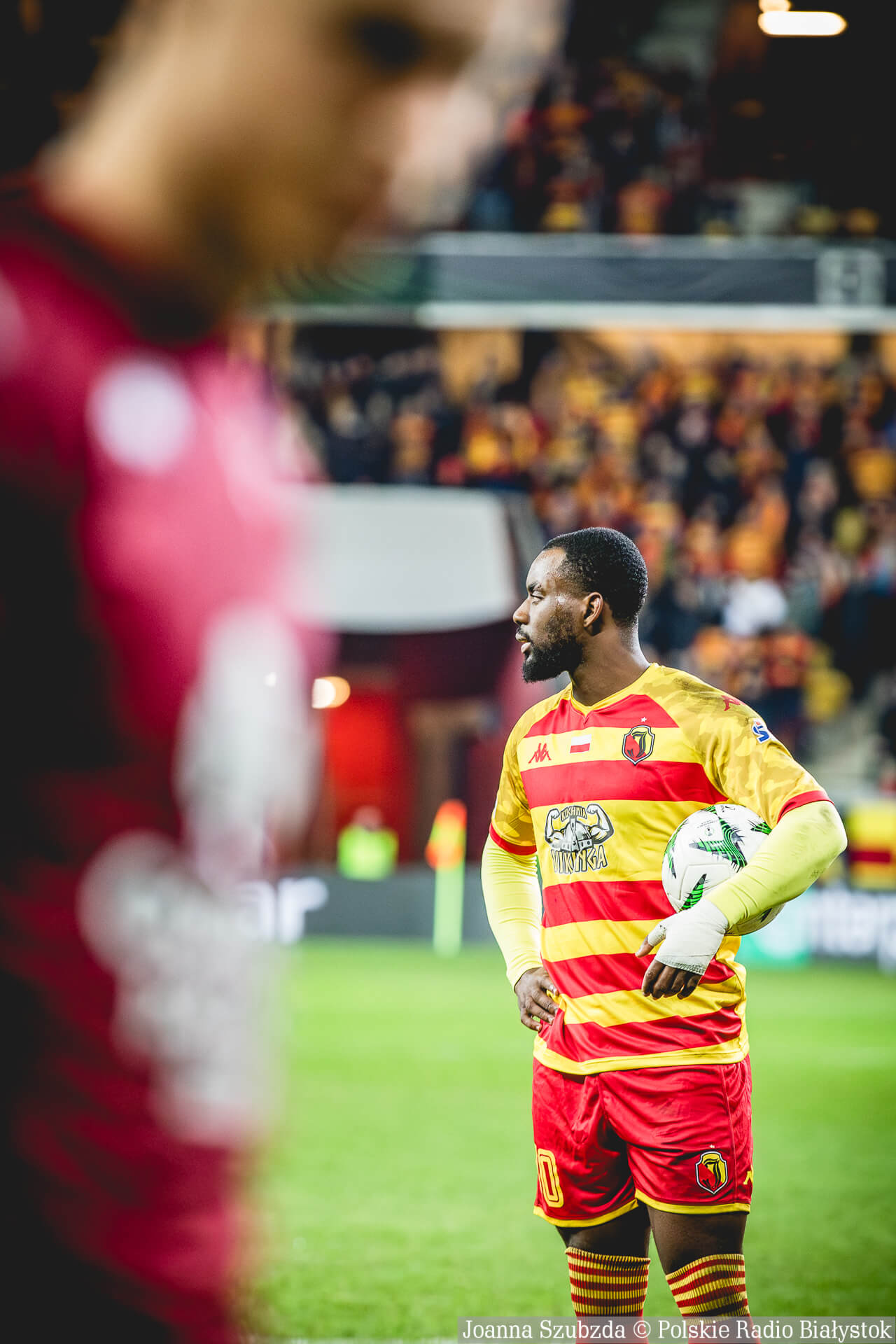 W 66. minucie Jagiellonia Białystok miała rzut karny za zagranie piłki rękę w polu karnym przez jednego z rywali. Sędziowie jeszcze sprawdzali tę sytuację na monitorach i ostatecznie potwierdzili pierwszą decyzję sędziego. Rzut karny na gola zamienił Afimico Pululu.