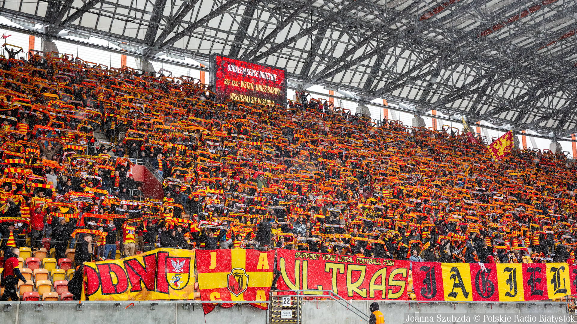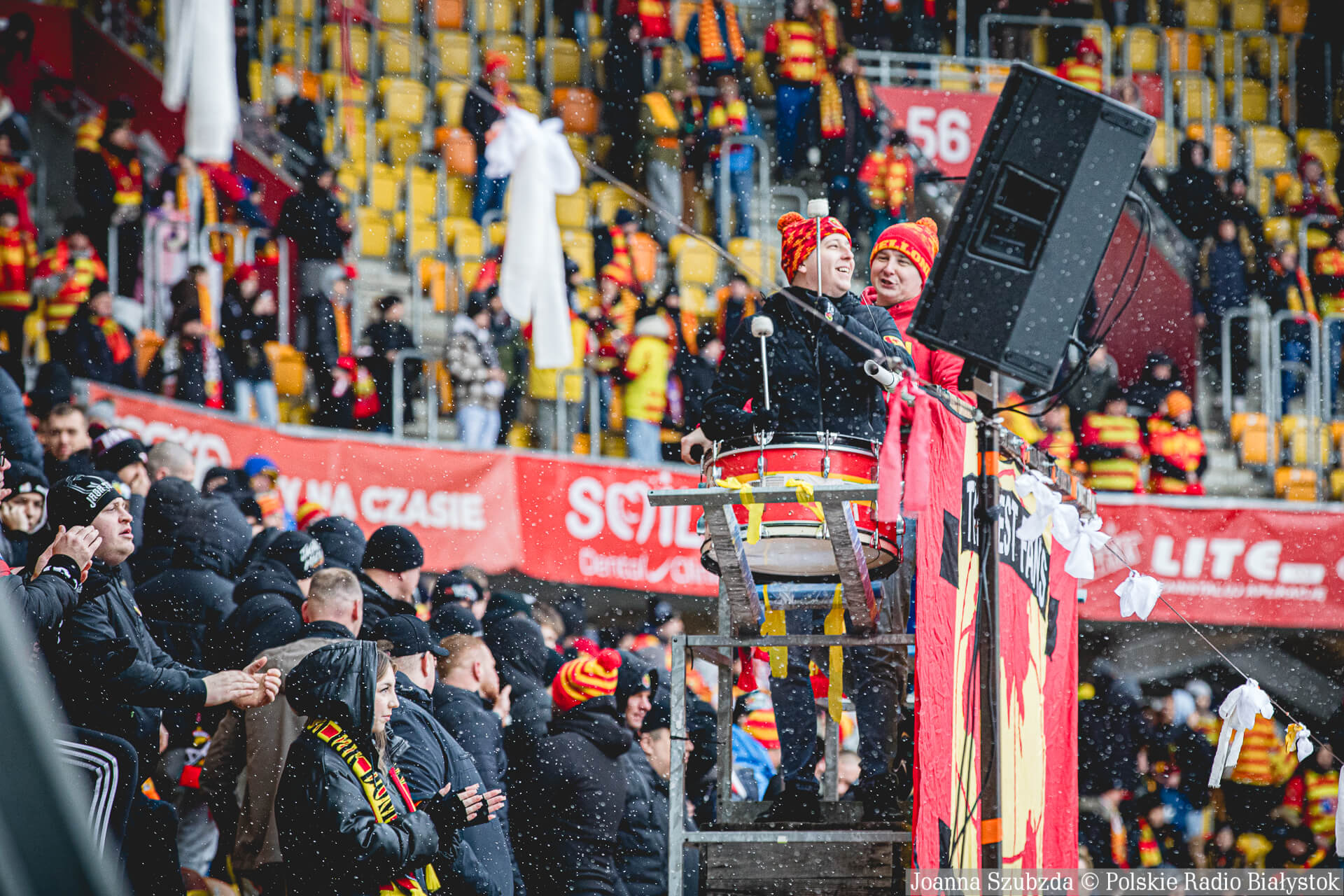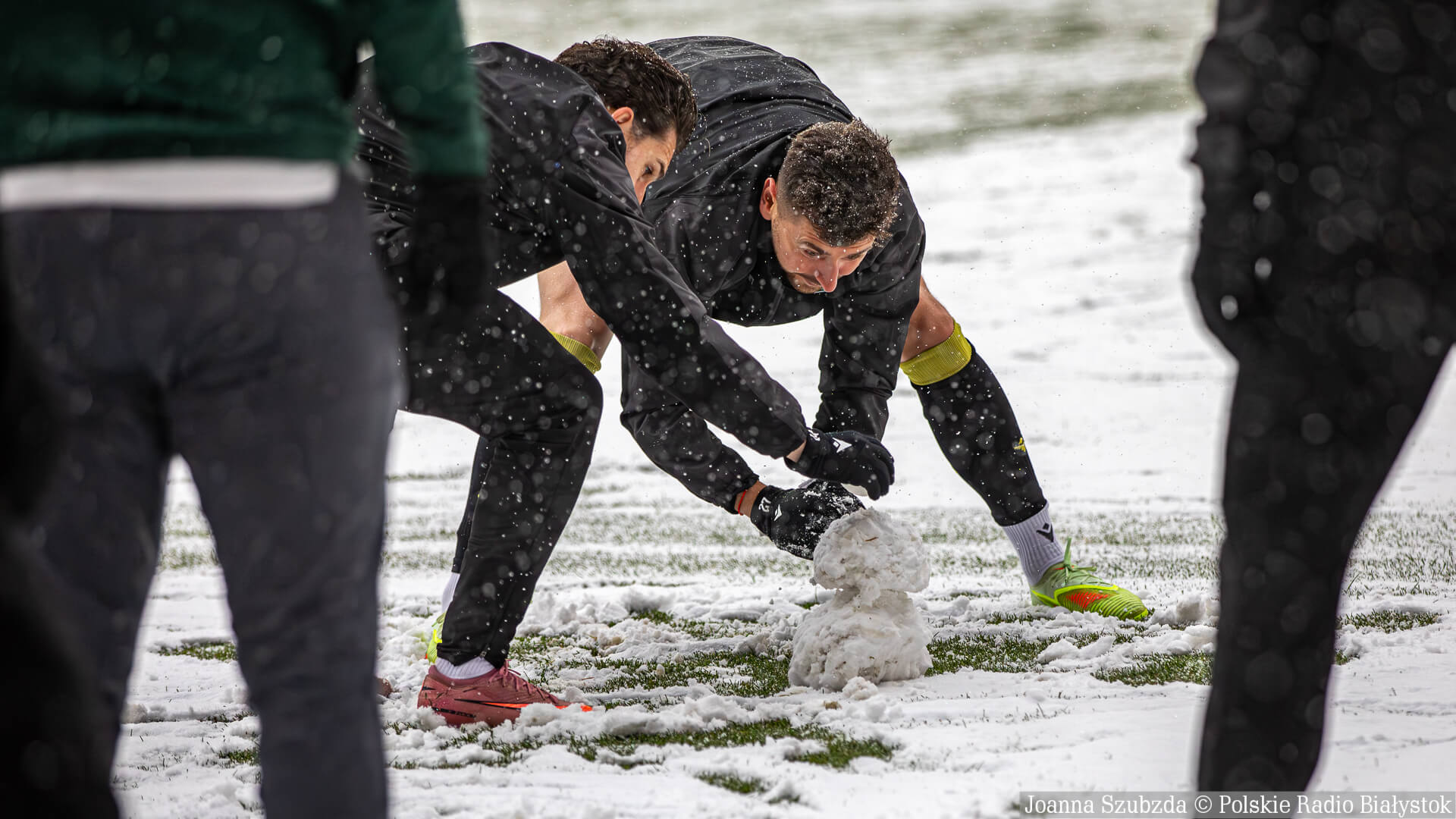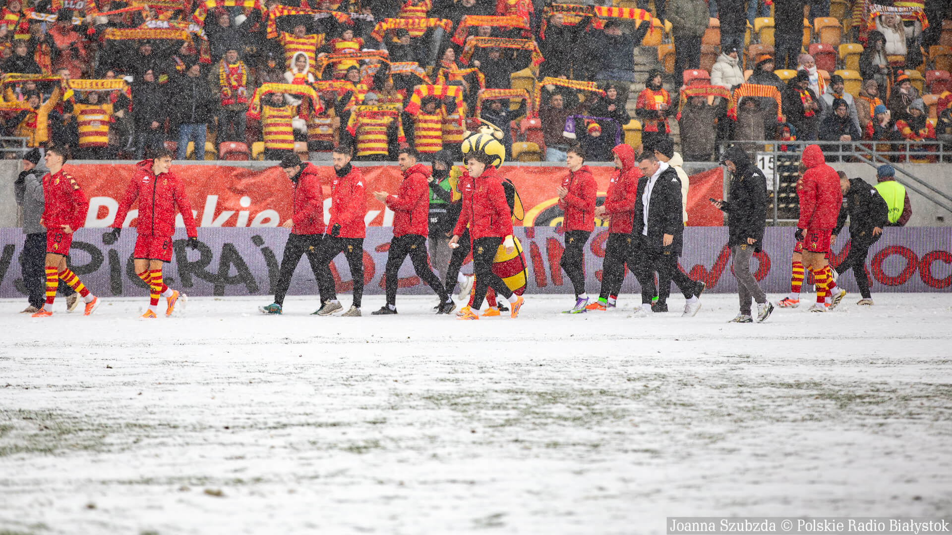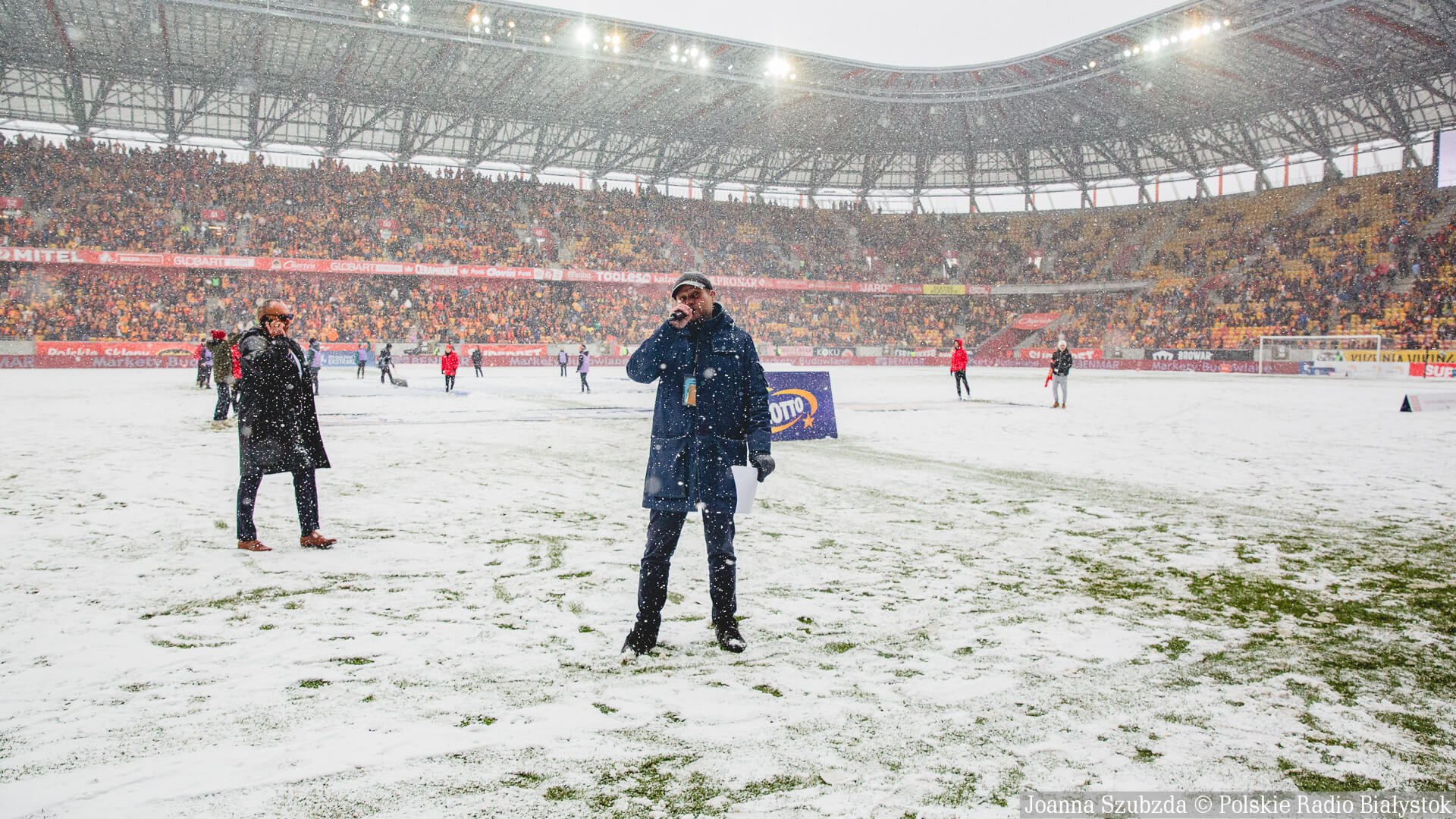 Ponad godzinę przed meczem zaczął w Białymstoku padać gęsty śnieg i w krótkim czasie boisko było już białe.