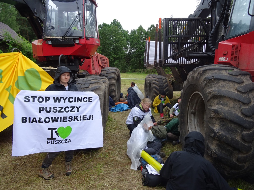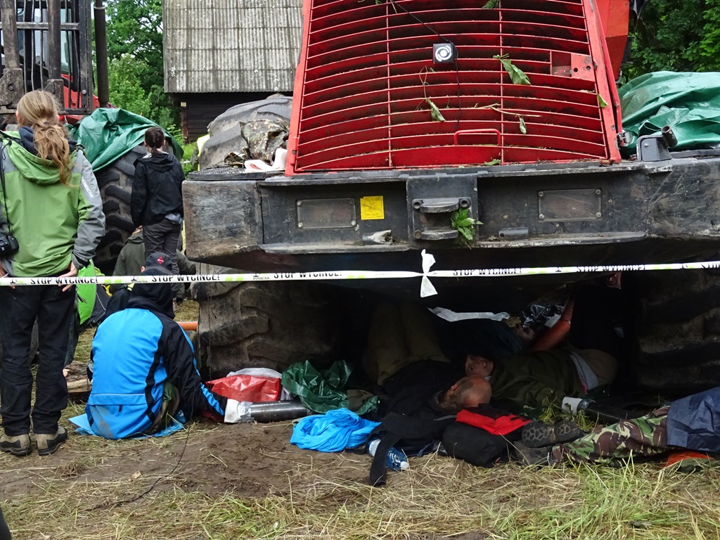 Kilkunastu aktywistów Greenpeace i Dzikiej Polski kolejny raz blokuje ciężki sprzęt do usuwania drzew w Puszczy Białowieskiej w nadleśnictwie Browsk.