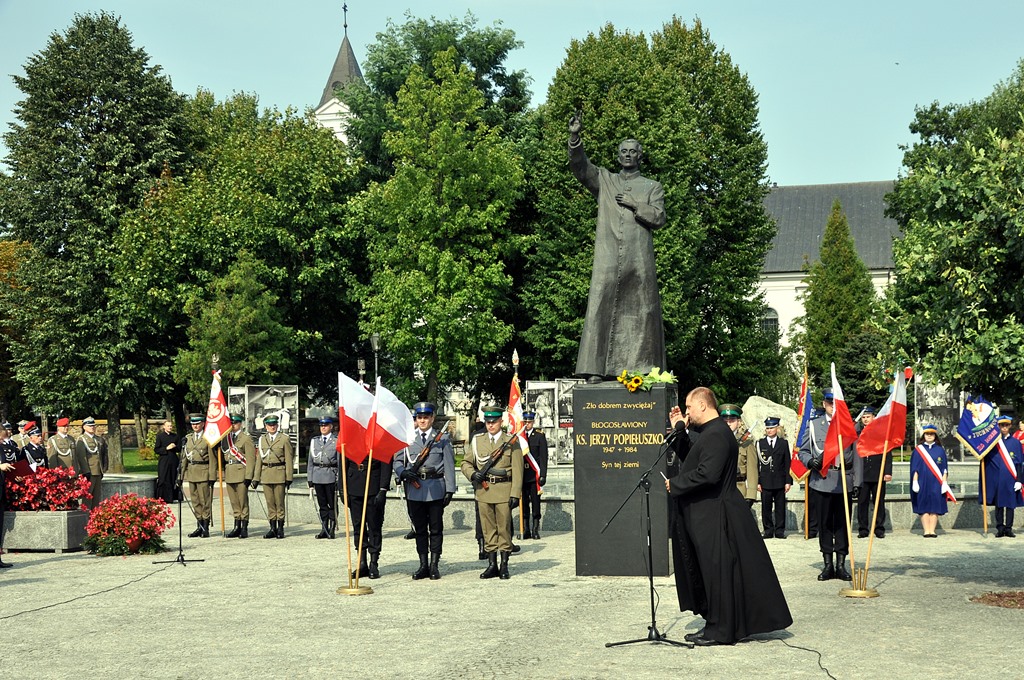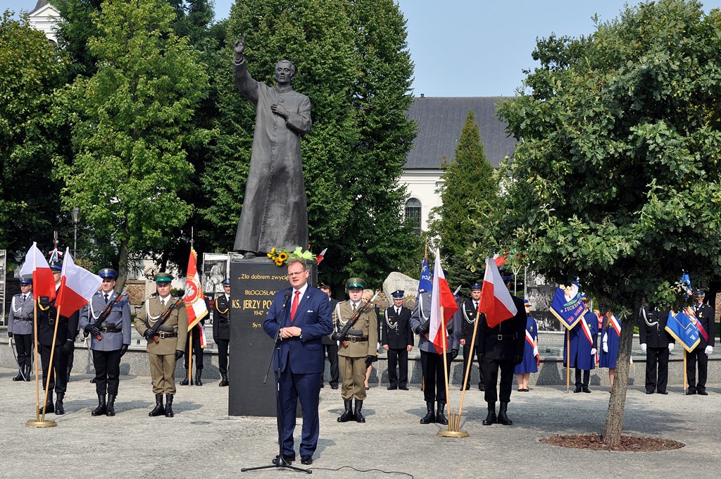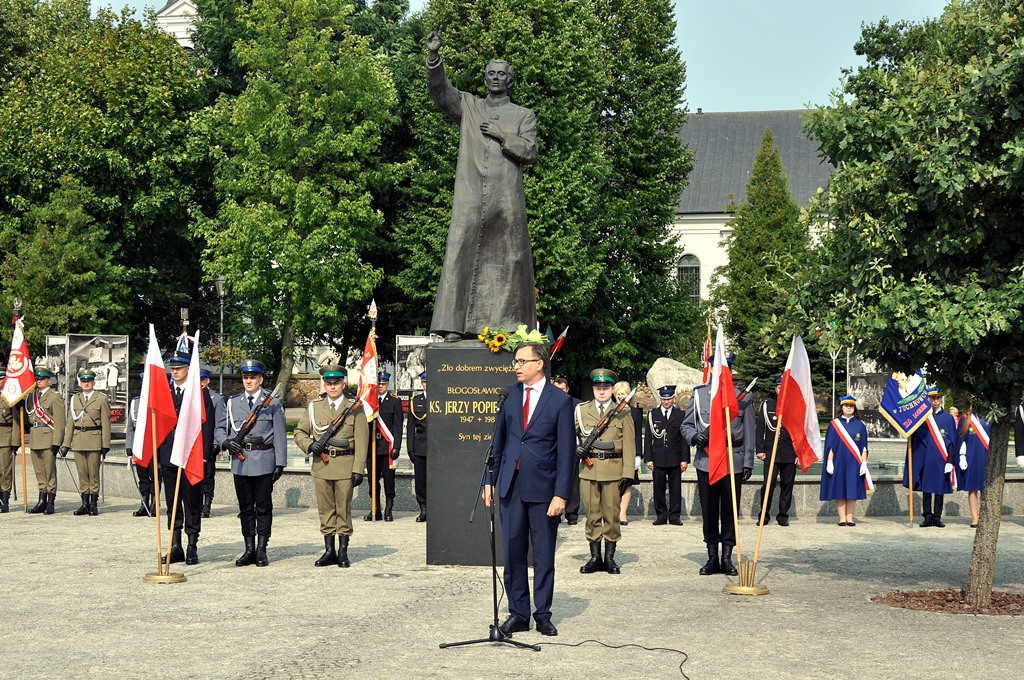 Z pokorą, ale i wdzięcznością dziękujemy dzisiaj panu Bogu za dar jego życia, za dar jego dzieła. Za to, że dzięki niemu dzisiaj jesteśmy wolni, przełamaliśmy, a do tego prowadził nas ksiądz Jerzy Popiełuszko, totalitaryzm, przełamaliśmy zniewolenie, komunizm. Odzyskaliśmy niepodległość, suwerenność. Pokonaliśmy pod jego przewodnictwem znaczną część zła, bo pamiętamy jego najważniejsze słowa - "zło dobrem zwyciężaj" - mówił podczas uroczystości Jarosław Zieliński.