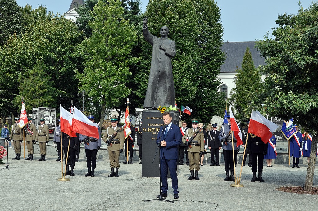 Szef MSWiA Mariusz Błaszczak przypomniał w swoim wystąpieniu przy pomniku ks. Jerzego Popiełuszki w Suchowoli, że duchowny w swoich kazaniach, w czasie mszy za ojczyznę, "mówił o Polsce solidarnej, wolnej i demokratycznej".