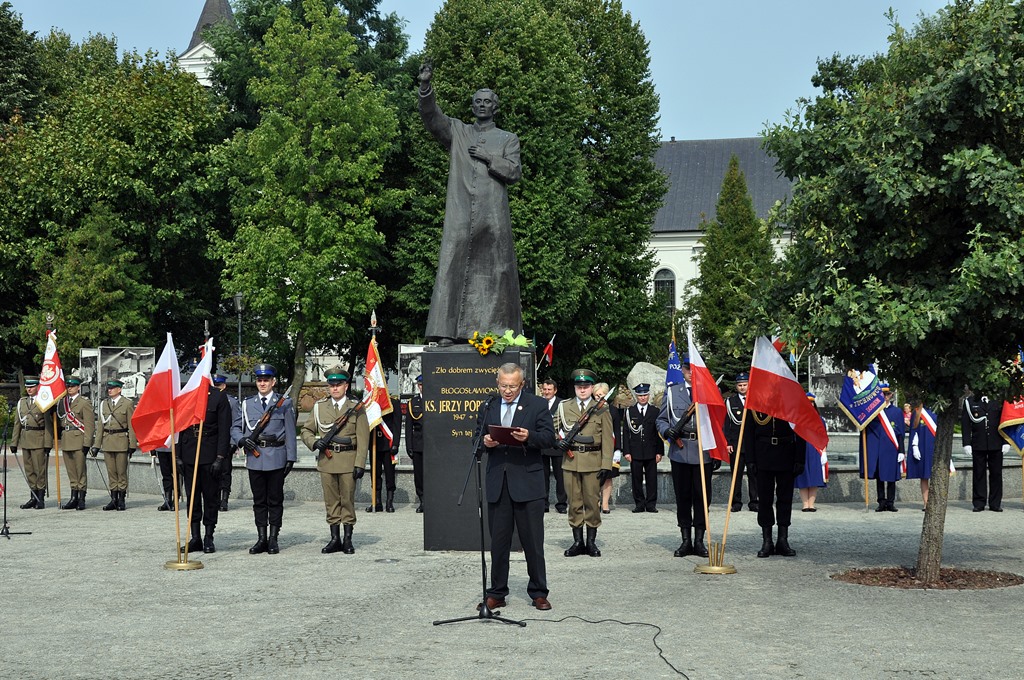 Prezes PiS Jarosław Kaczyński napisał m.in: "trudno z całą pewnością orzekać o czymś, co się nie zdarzyło, ale zaryzykowałbym stwierdzenie, że bez księdza Jerzego Solidarność mogłaby nie przetrwać". Wspomniał rodziców księdza: Mariannę i Władysława, którzy ukształtowali go duchowo w wierze i patriotyzmie. Przypomniał, że prezydent Lech Kaczyński nadał ks. Popiełuszce pośmiertnie Order Orła Białego, a Mariannę Popiełuszko odznaczył Krzyżem Komandorskim z Gwiazdą.