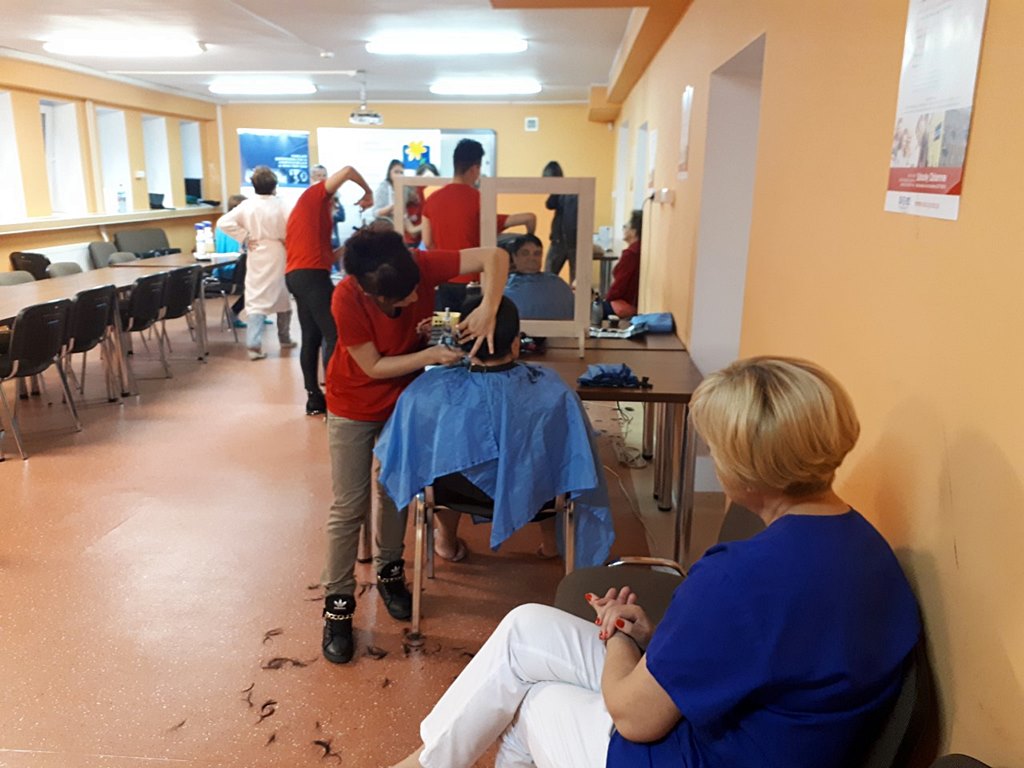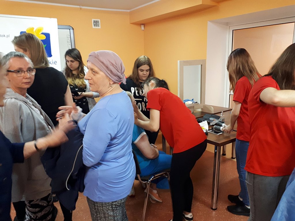 We wtorek (3.10) kilkunastu uczniów strzygło i czesało i malowało pacjentów przebywających na terapii. Chętni do skorzystania z tych usług czekali jeszcze przed rozpoczęciem metamorfoz. Podobne akcje będą się odbywać raz w tygodniu przez cały październik, który od lat jest obchodzony jako miesiąc walki z rakiem. Pacjenci są o tym szczegółowo informowani.