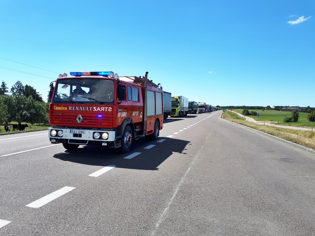 Droga była zablokowana. Samochody ciężarowe musiały stać w korku, a osobówki były kierowane na objazdy lokalnymi drogami przez okoliczne miejscowości.
