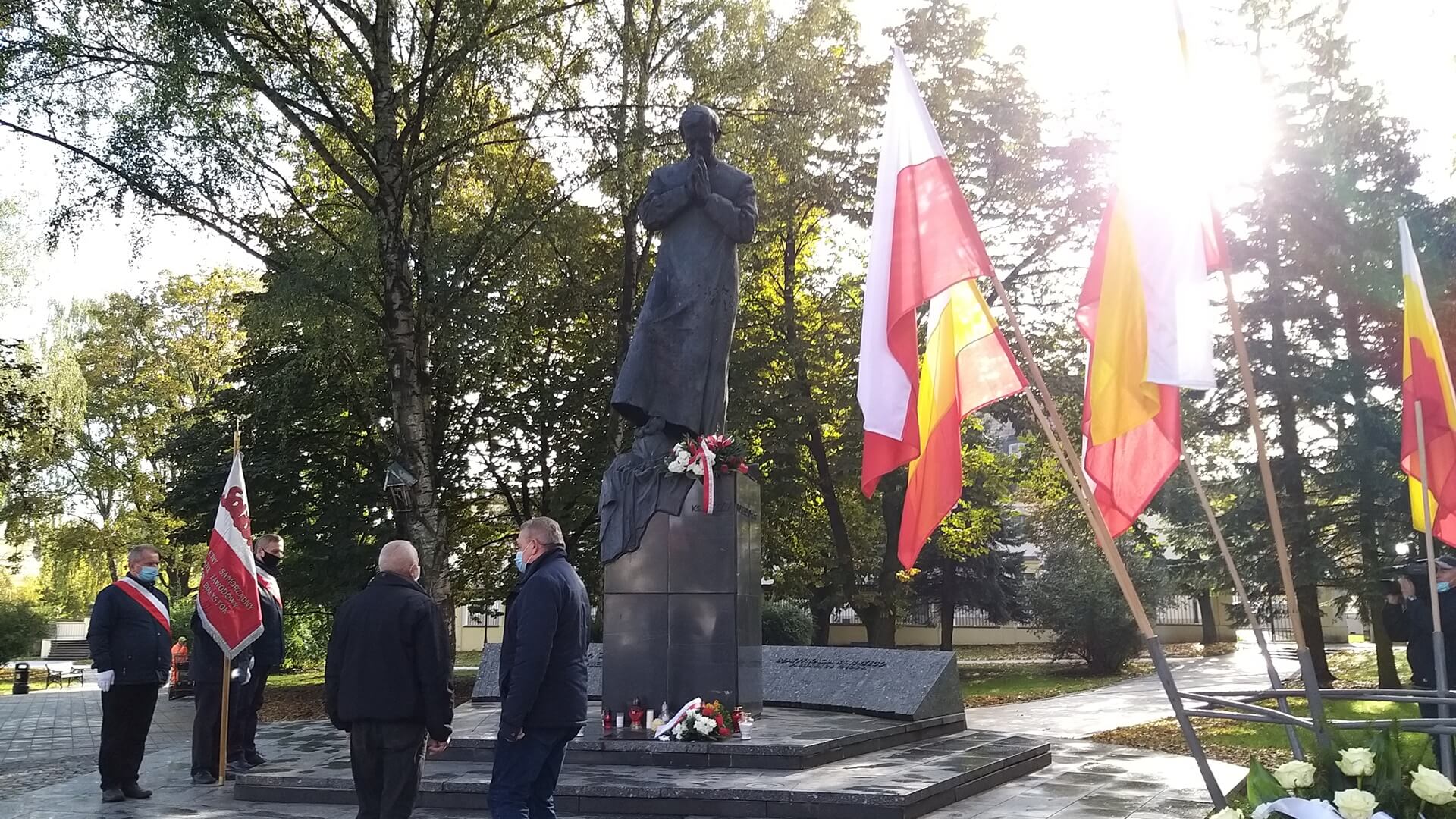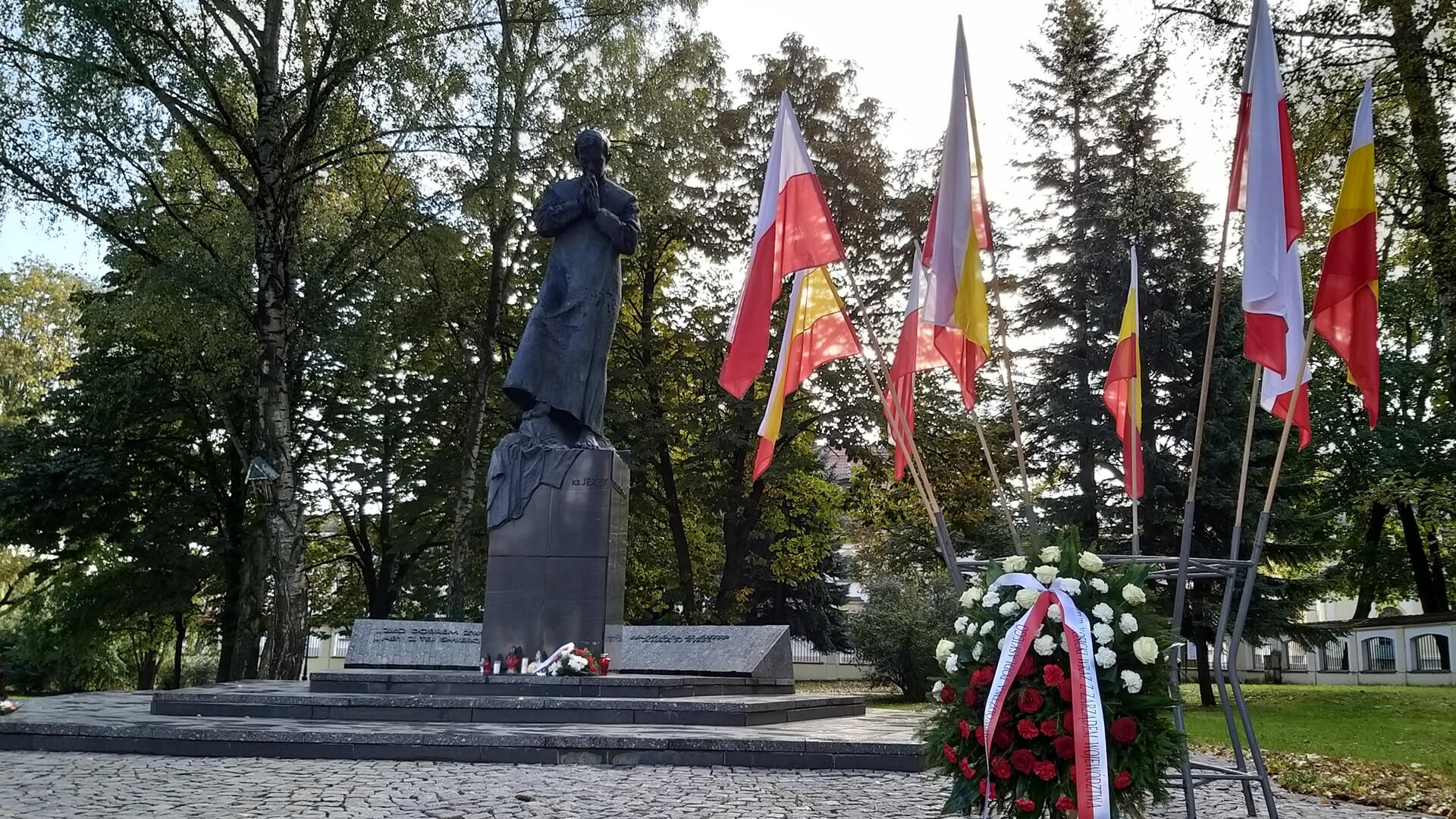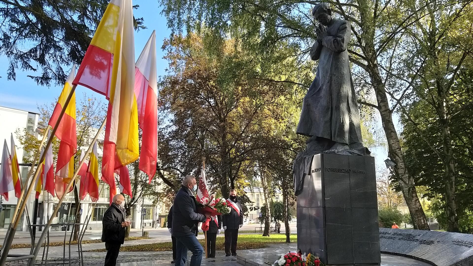 Przed pomnikiem kapłana w Białymstoku kwiaty złożyli m.in. marszałek województwa podlaskiego Artur Kosicki i przewodniczący Zarządu Regionu Podlaskiego NSZZ “Solidarność” Józef Mozolewski. Przy tym symbolicznym miejscu upamiętnienia błogosławionego zatrzymują się też zwyczajni mieszkańcy Białegostoku.