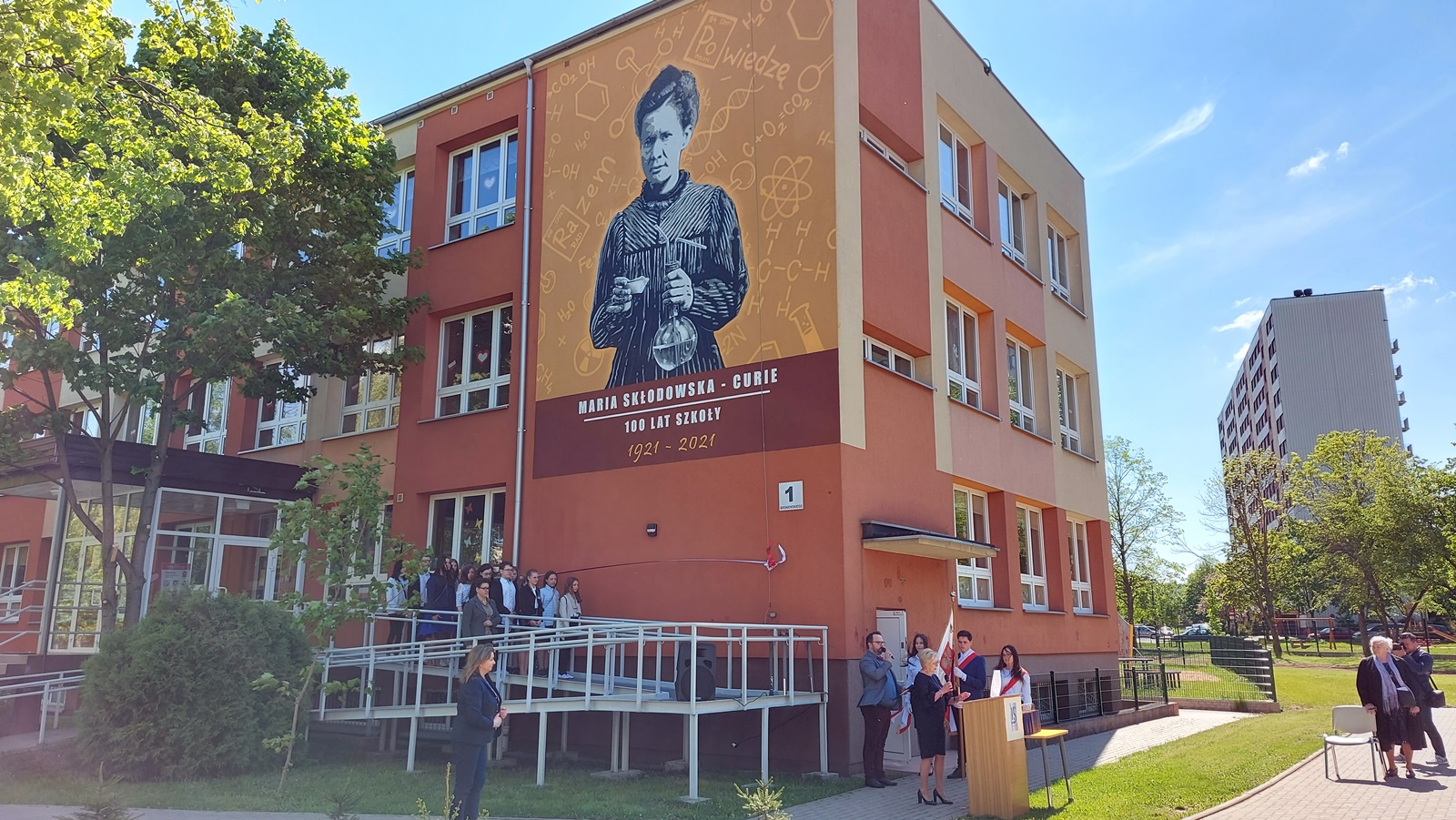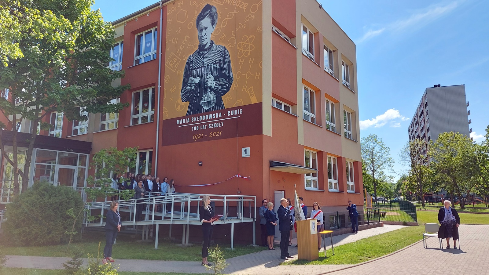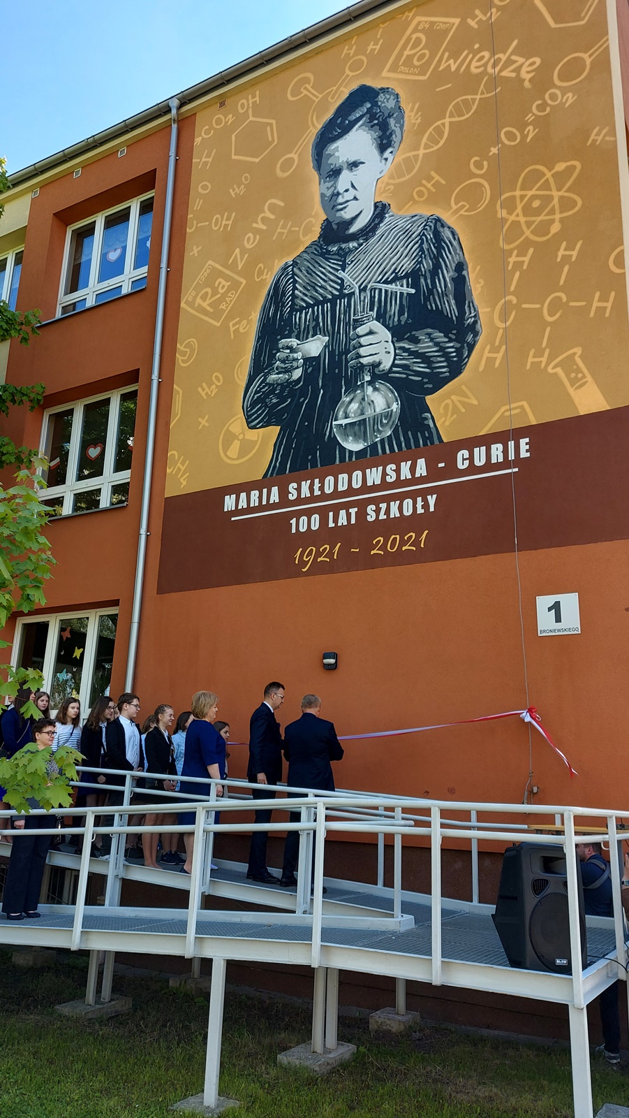 Z okazji 100. rocznicy powstania placówki oficjalnie przecięto wstęgę przy muralu na ścianie szkoły, na którym jest patronka placówki - Maria Skłodowska-Curie. Wizerunek dwukrotnej polskiej noblistki powstał w kwietniu, a teraz został oficjalnie zaprezentowany.