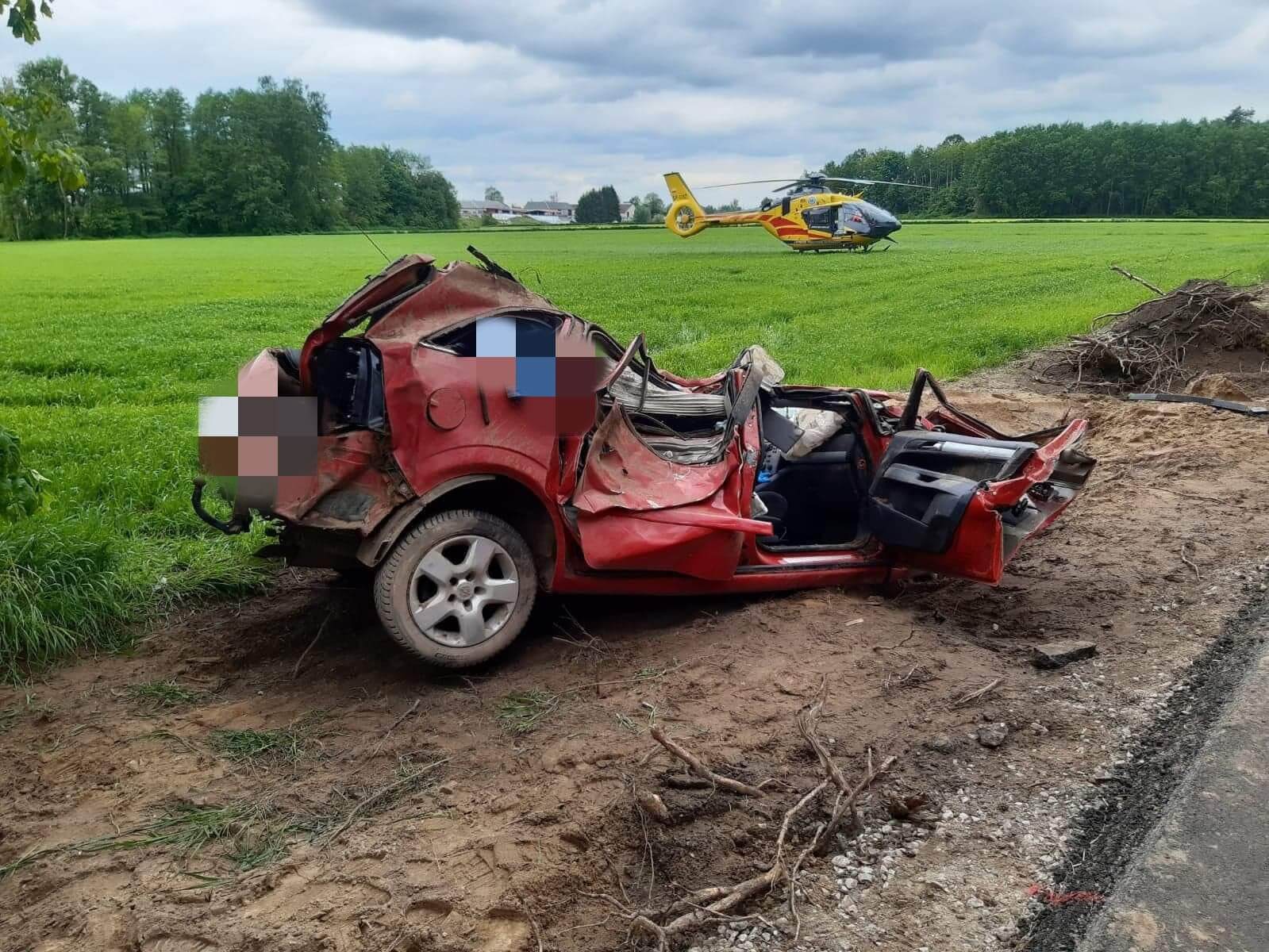 Samochód wpadł do rowu, następnie dachował. Rannego mężczyznę do szpitala zabrał śmigłowiec Lotniczego Pogotowia Ratunkowego. Droga w miejscu wypadku jest zablokowana.