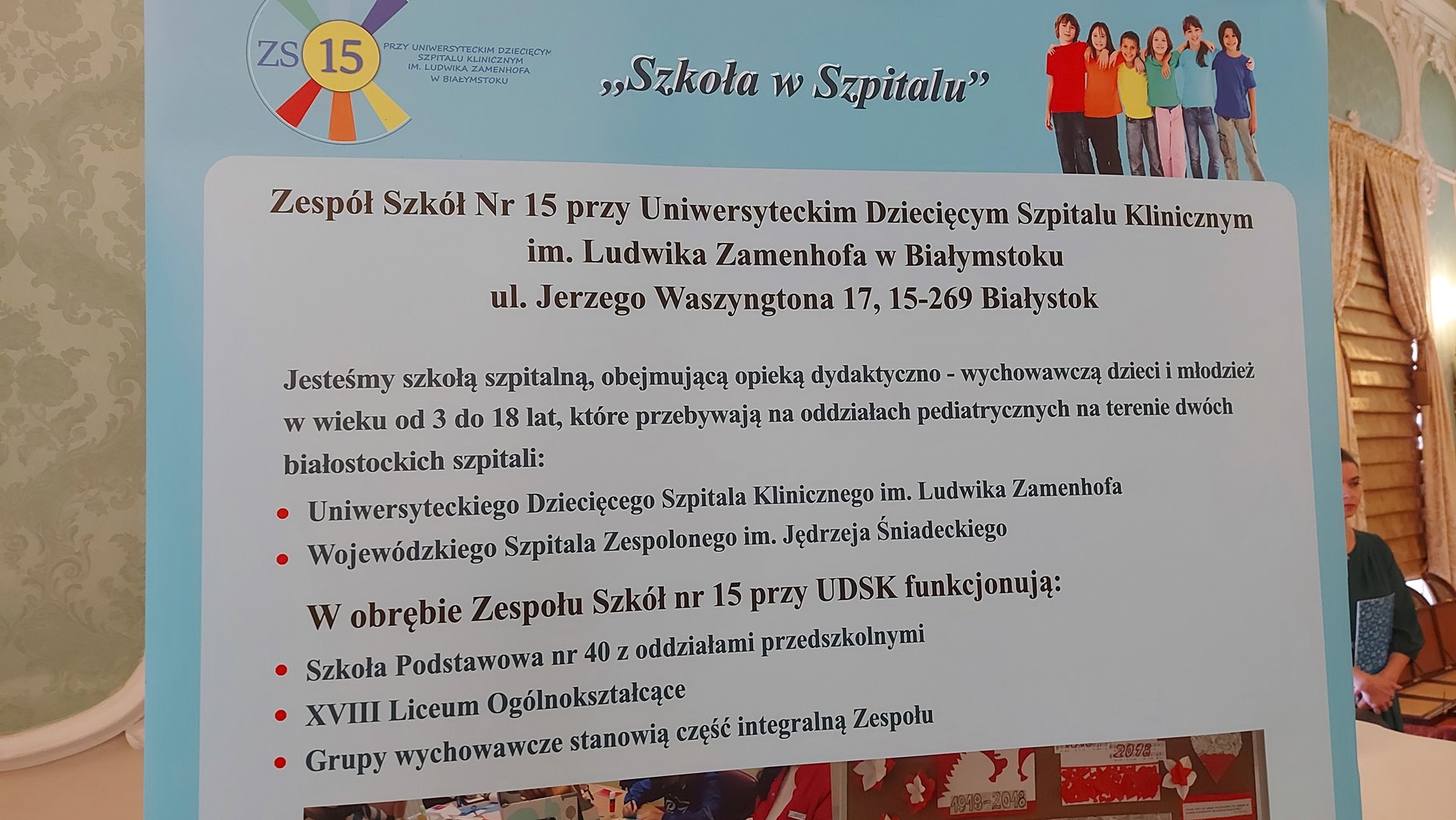 To jedyna taka placówka w województwie podlaskim. Jak mówi dyrektor Elżbieta Sokólska: "wspomagamy proces edukacyjny, zabawę, terapię; uczymy tam, gdzie jest to możliwe, nie tylko w szkolnych salach, ale też w salach szpitalnych, na korytarzach, w świetlicach i na stołówkach".