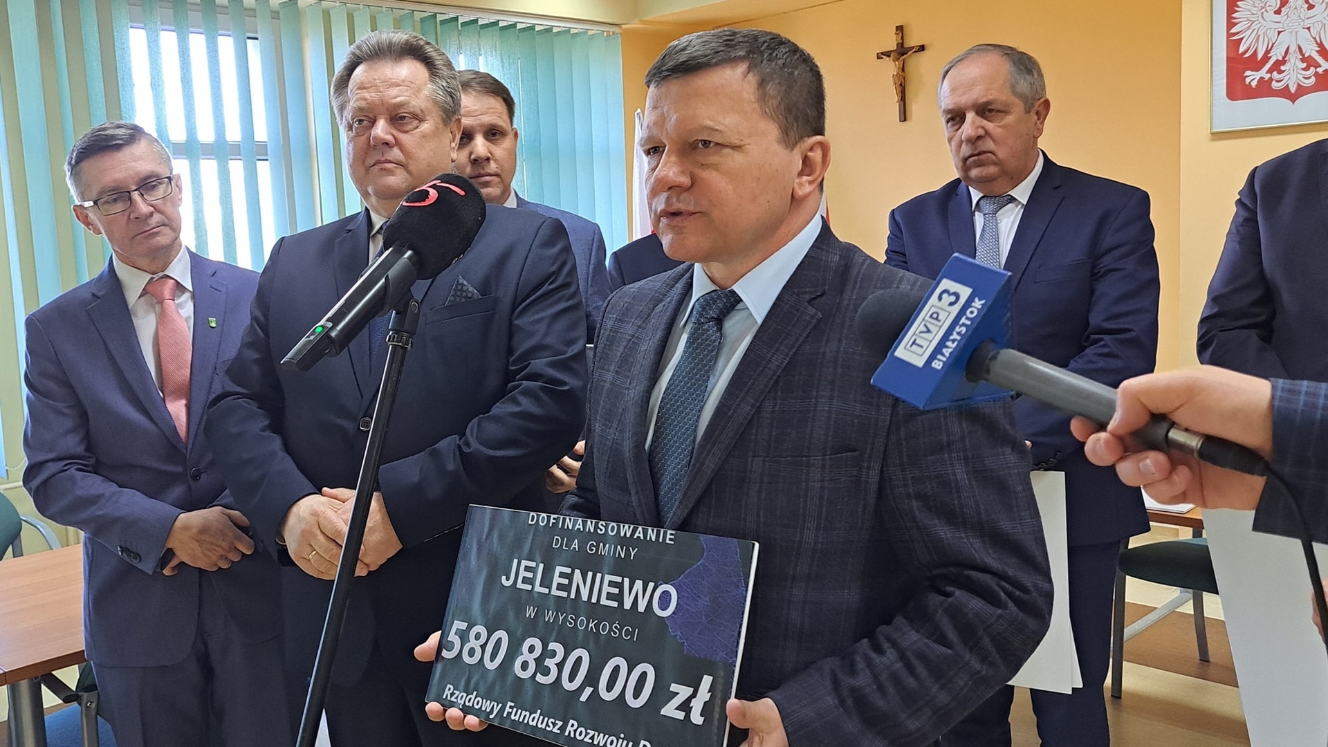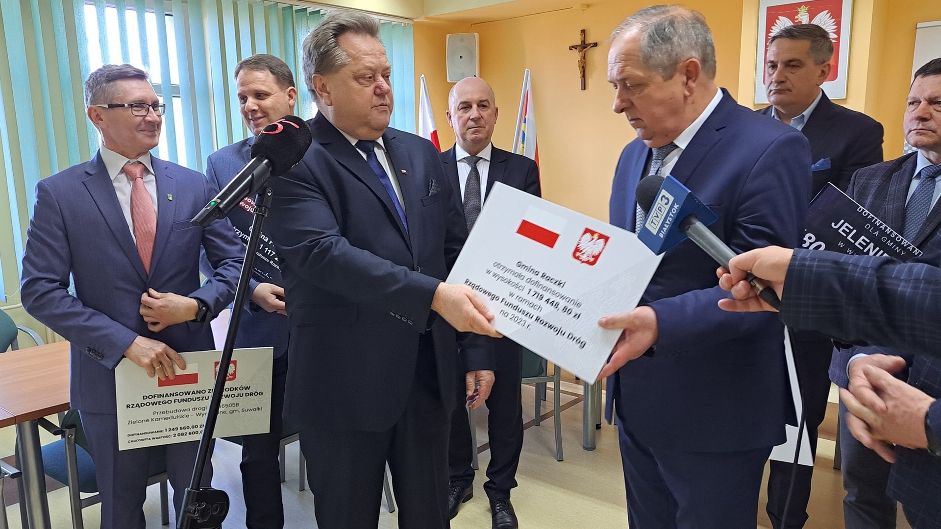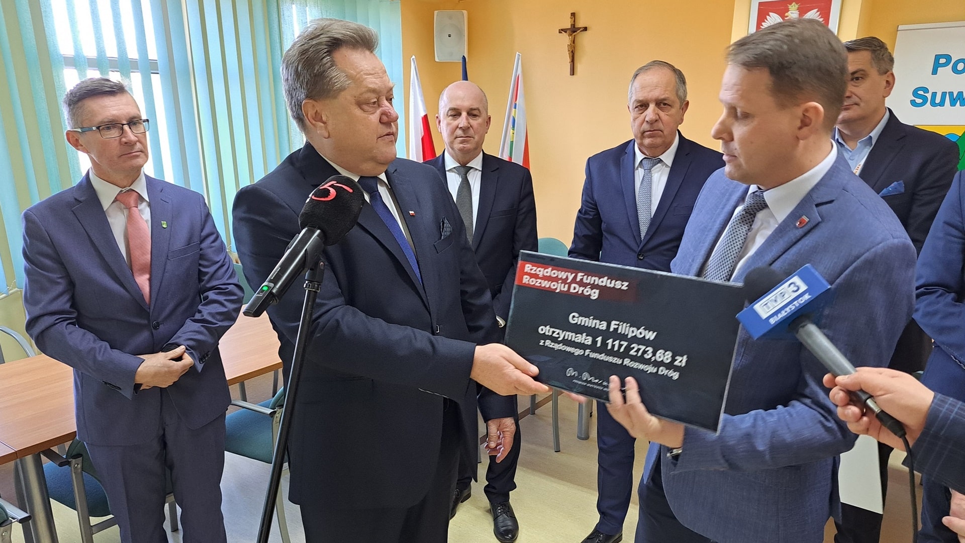 We wtorek (14.02) na konferencji prasowej samorządowcy z miasta, powiatu oraz gmin - Bakałarzewo, Filipów, Raczki, Jeleniewo i Suwałki otrzymali od posła Prawa i Sprawiedliwości Jarosława Zielińskiego symboliczne czeki.