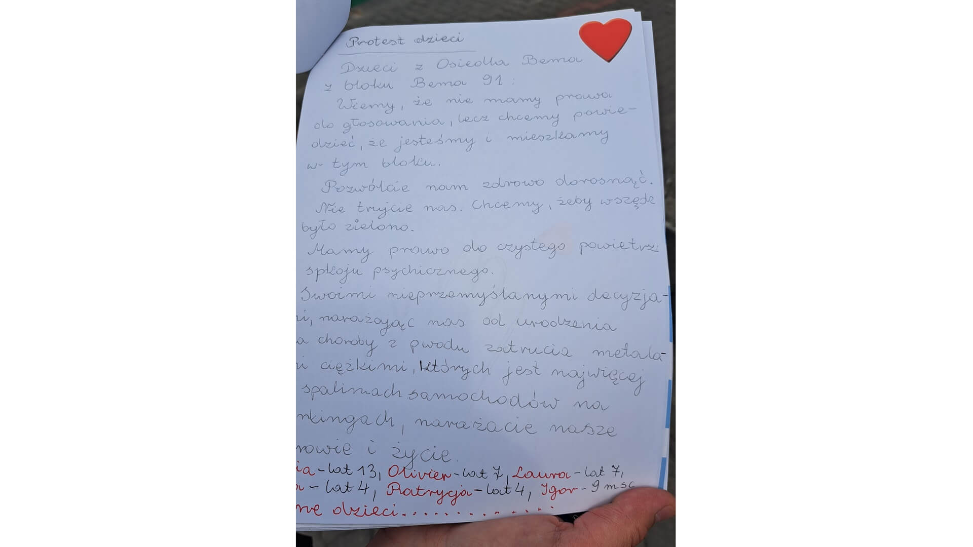 Protestujący mieszkańcy chcą jednak, by nadal był tam teren zielony. Podkreślają, że trzeba cenić to, że na osiedlu jest zieleń, że nie chcą spalin i hałasu pod swoimi oknami i że warto działkę zagospodarować w taki sposób, by służył rekreacji.