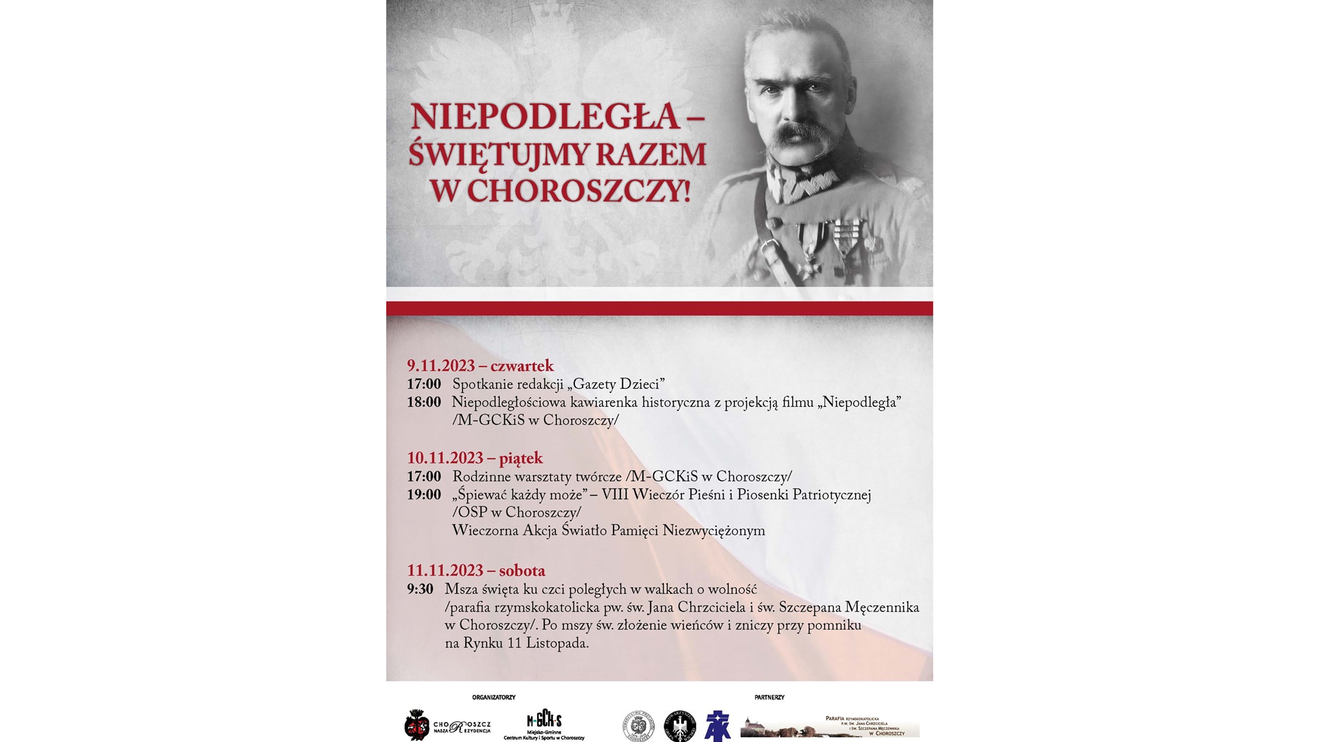Zakończeniem Narodowego Święta Niepodległości w gminie Choroszcz będą oficjalne uroczystości: 11 listopada, o 9:30 w kościele pw. św. Jana Chrzciciela i św. Szczepana Męczennika w Choroszczy odprawiona będzie msza święta za Ojczyznę. Bezpośrednio po liturgii na Rynku 11 Listopada, przy pomniku ku czci poległych w walkach o wolność wszyscy chętni mogą wziąć udział w złożeniu kwiatów i zniczy.
