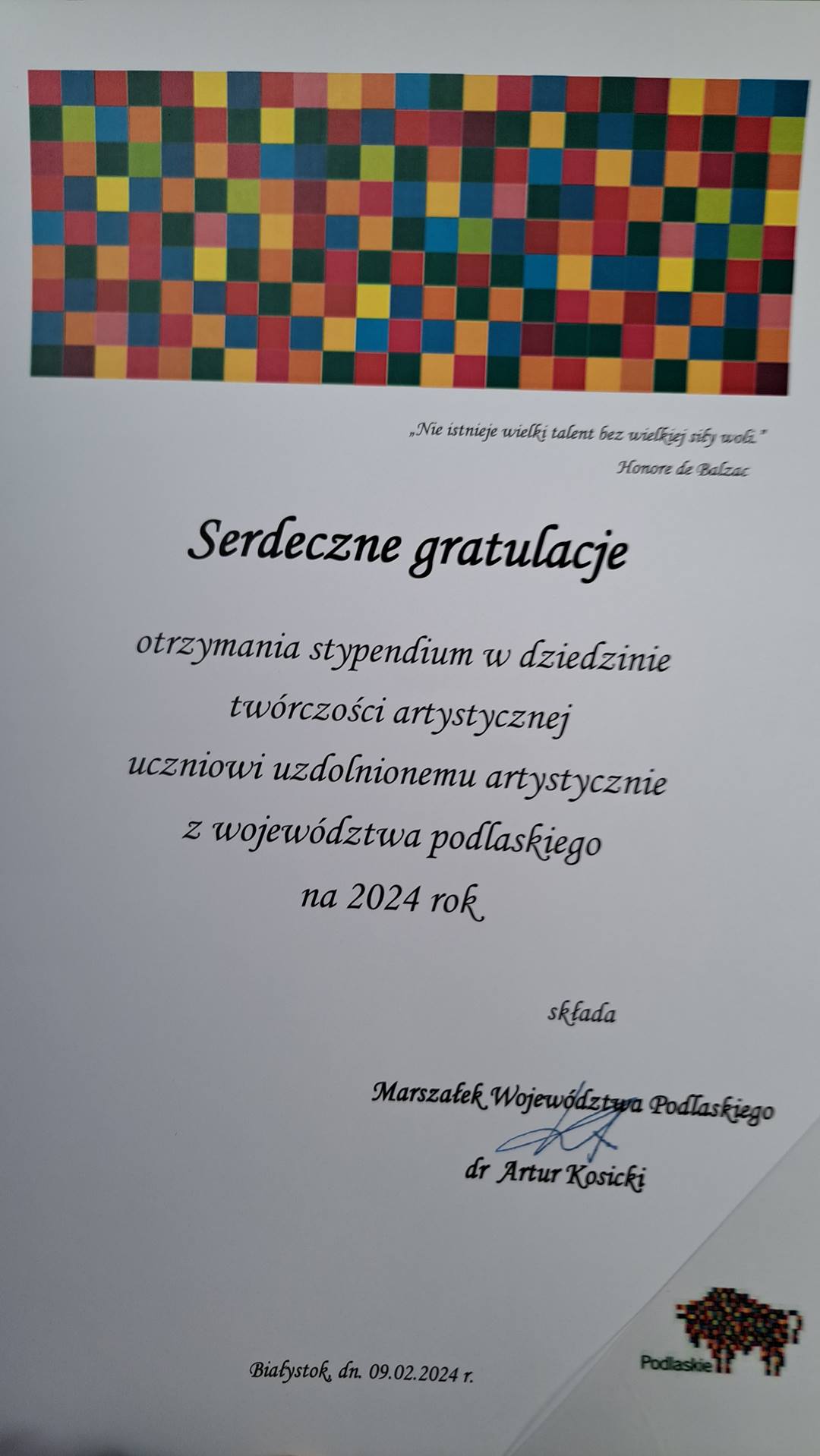Rekordowa liczba uczniów uzdolnionych artystycznie otrzymała w piątek (9.02) stypendia marszałka województwa podlaskiego.