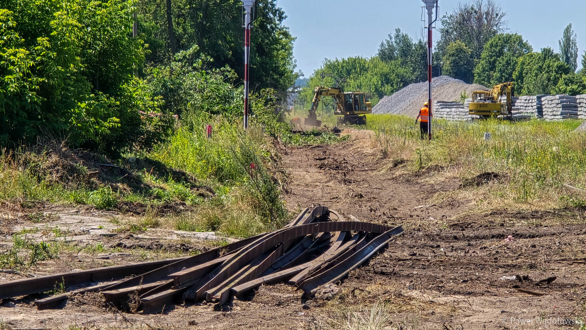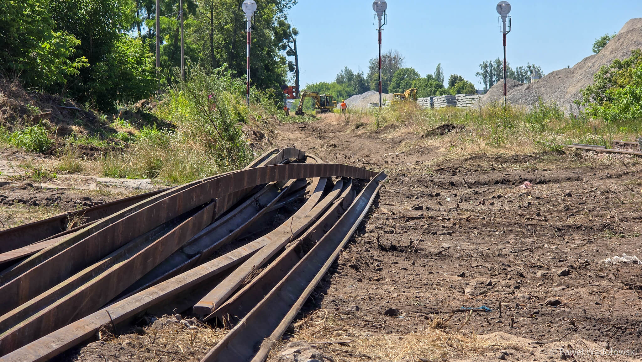 Pracownicy firmy, która prowadzi prace, powoli oddzielają stalowe szyny od podkładów, tną je na mniejsze fragmenty i usuwają z torowiska. Później usuwają także podkłady z warstwą ziemi.