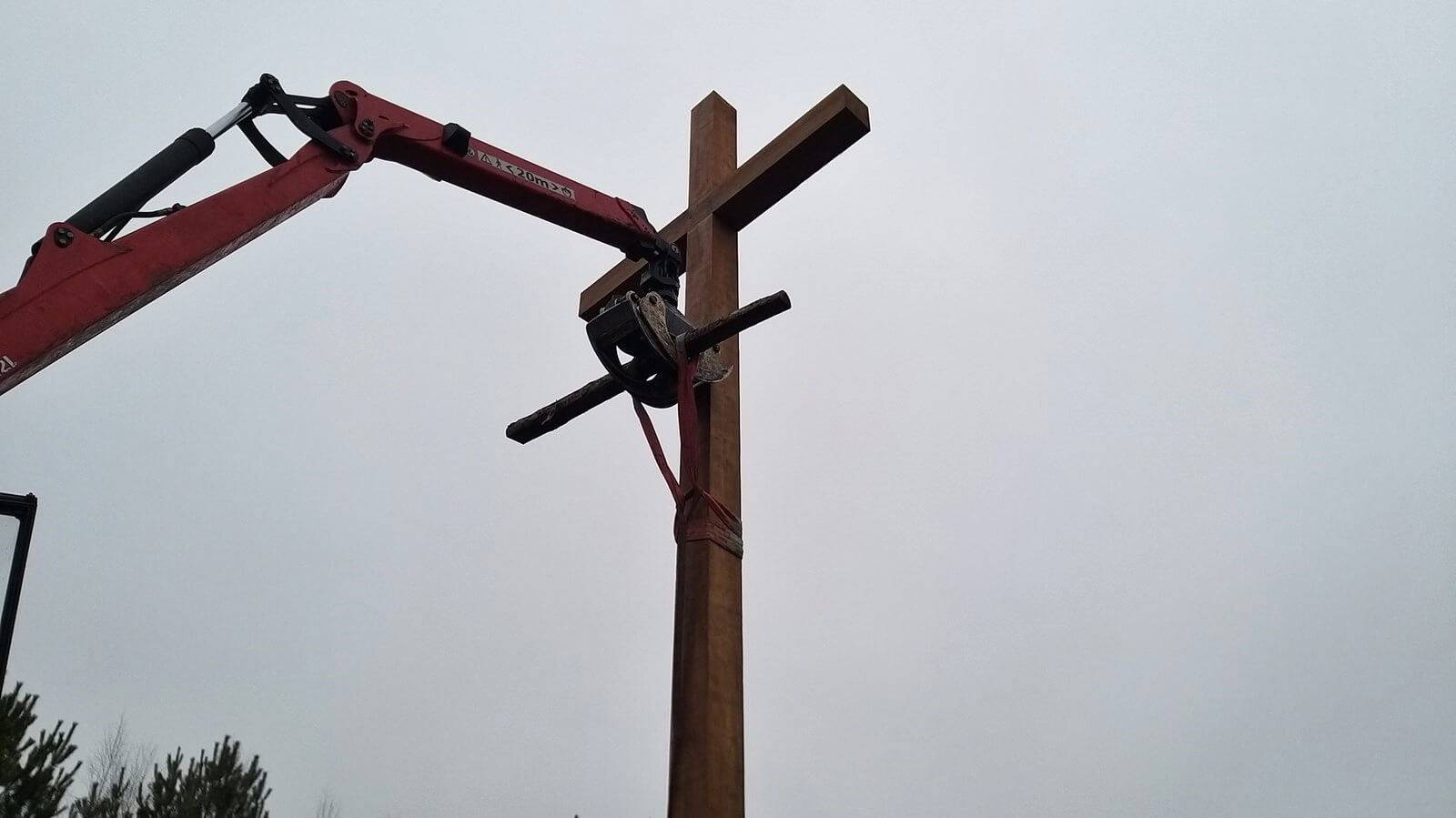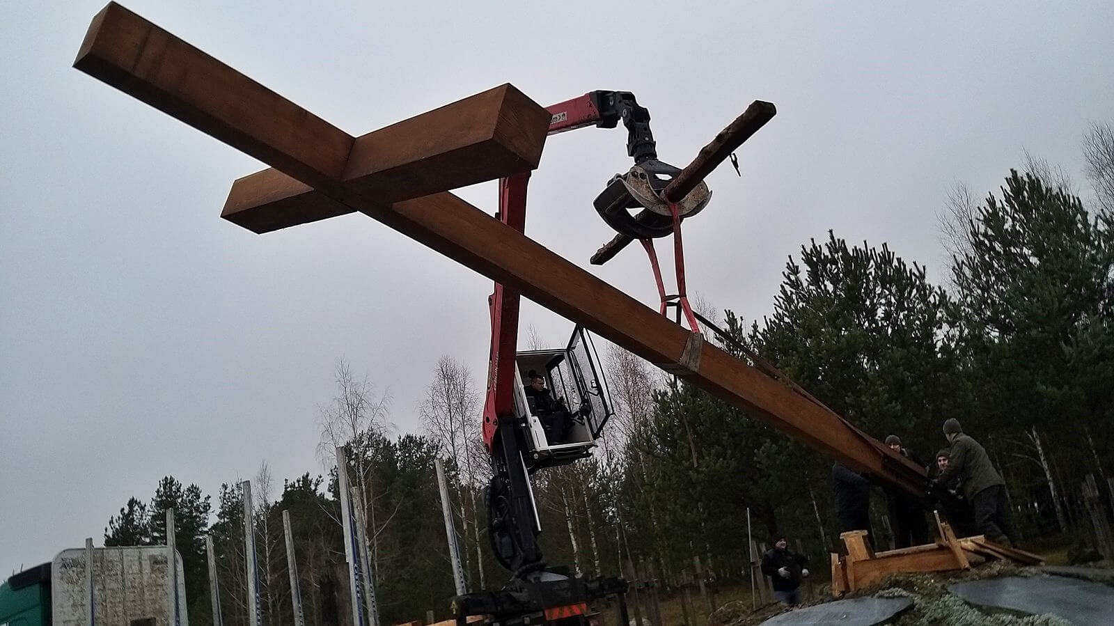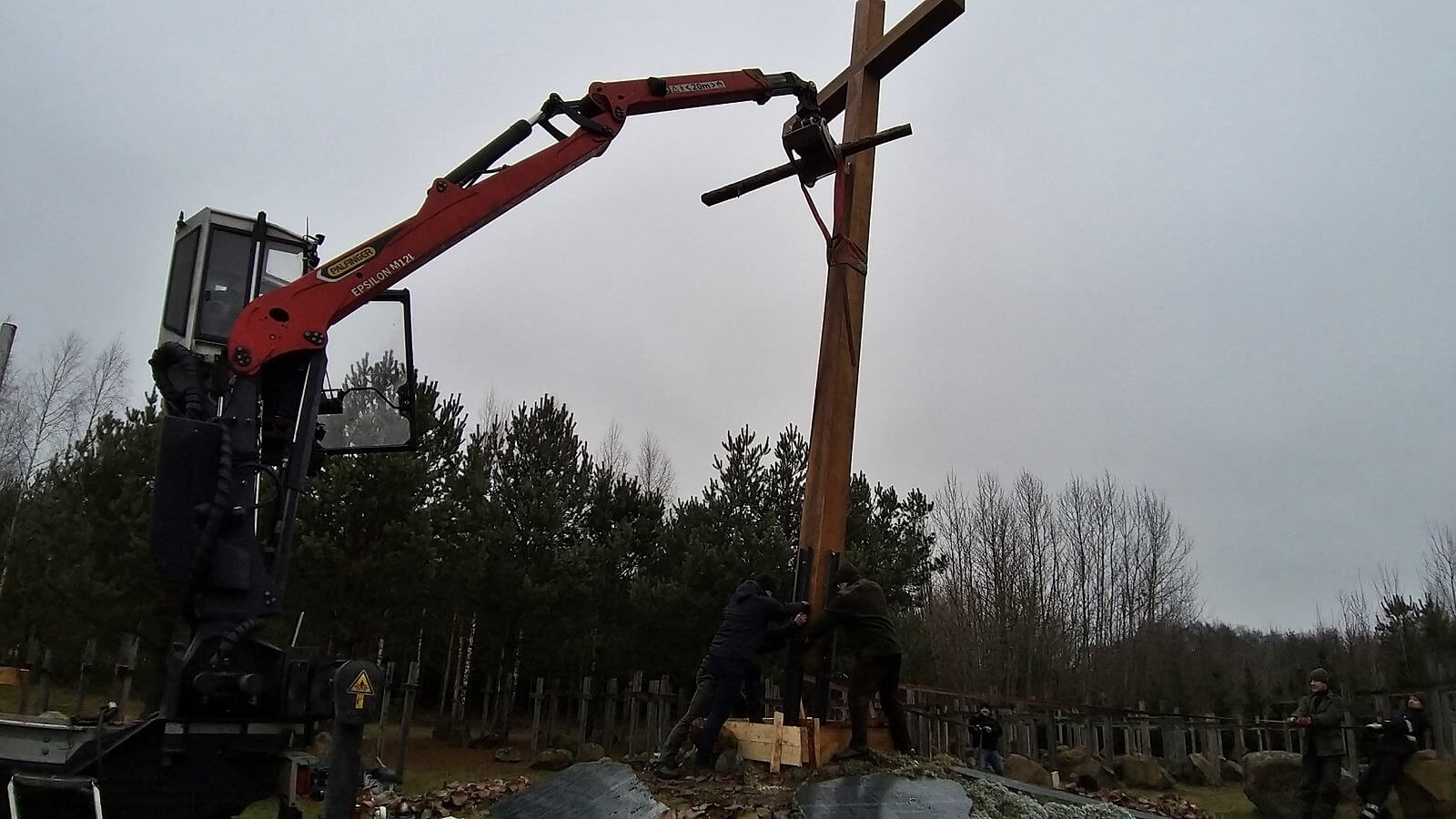 Modrzewiowy 10-metrowy krzyż waży ponad tonę. Został w sobotę ustawiony i zamontowany na zlecenie Związku Ofiar Obławy Augustowskiej 1945 roku. Robotnicy wykonują specjalną podstawę, która go utrzyma.