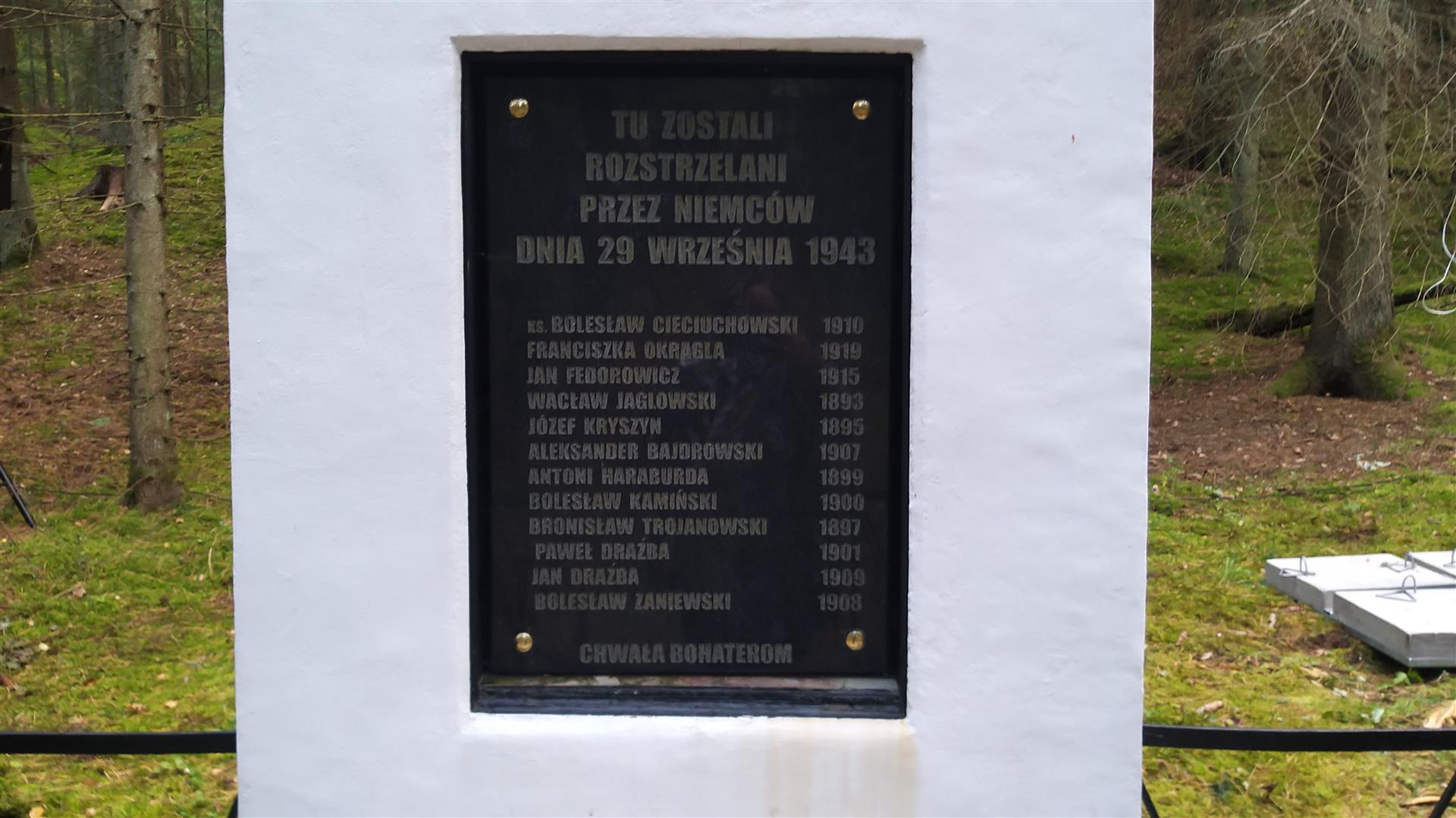 Tablica i obelisk stoją w miejscu, gdzie we wrześniu 1943 roku Niemcy zamordowali 12 Polaków, wśród których byli zarówno żołnierze Armii Krajowej, jak i ludność cywilna, w tym kobieta w zaawansowanej ciąży.